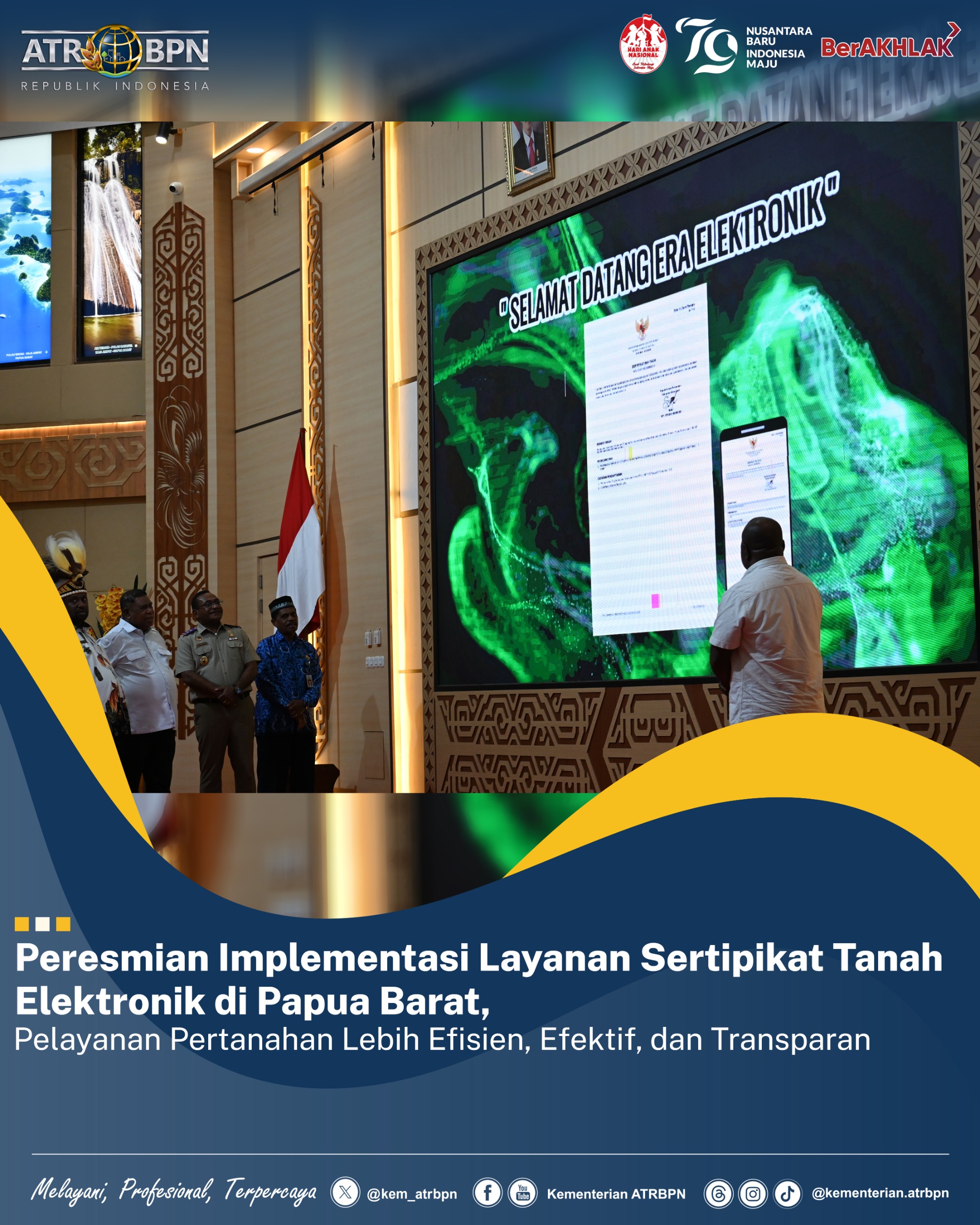 Manokwari – Berdasarkan Peraturan Menteri Agraria dan Tata Ruang/Kepala Badan Pertanahan Nasional (ATR/BPN) Nomor 3 Tahun 2023 tentang Penerbitan Dokumen Elektronik dalam Kegiatan Pendaftaran Tanah, Kantor Wilayah (Kanwil) BPN Provinsi Papua Barat meresmikan Implementasi Layanan Sertipikat Tanah Elektronik pada sembilan Kantor Pertanahan (Kantah) di lingkungan Kanwil BPN Provinsi Papua Barat, Rabu (17/07/2024) di Auditorium Provinsi Papua Barat. Transformasi layanan digital ini diharapkan bisa membuat pelayanan publik di bidang pertanahan dapat lebih efisien, efektif, dan transparan.