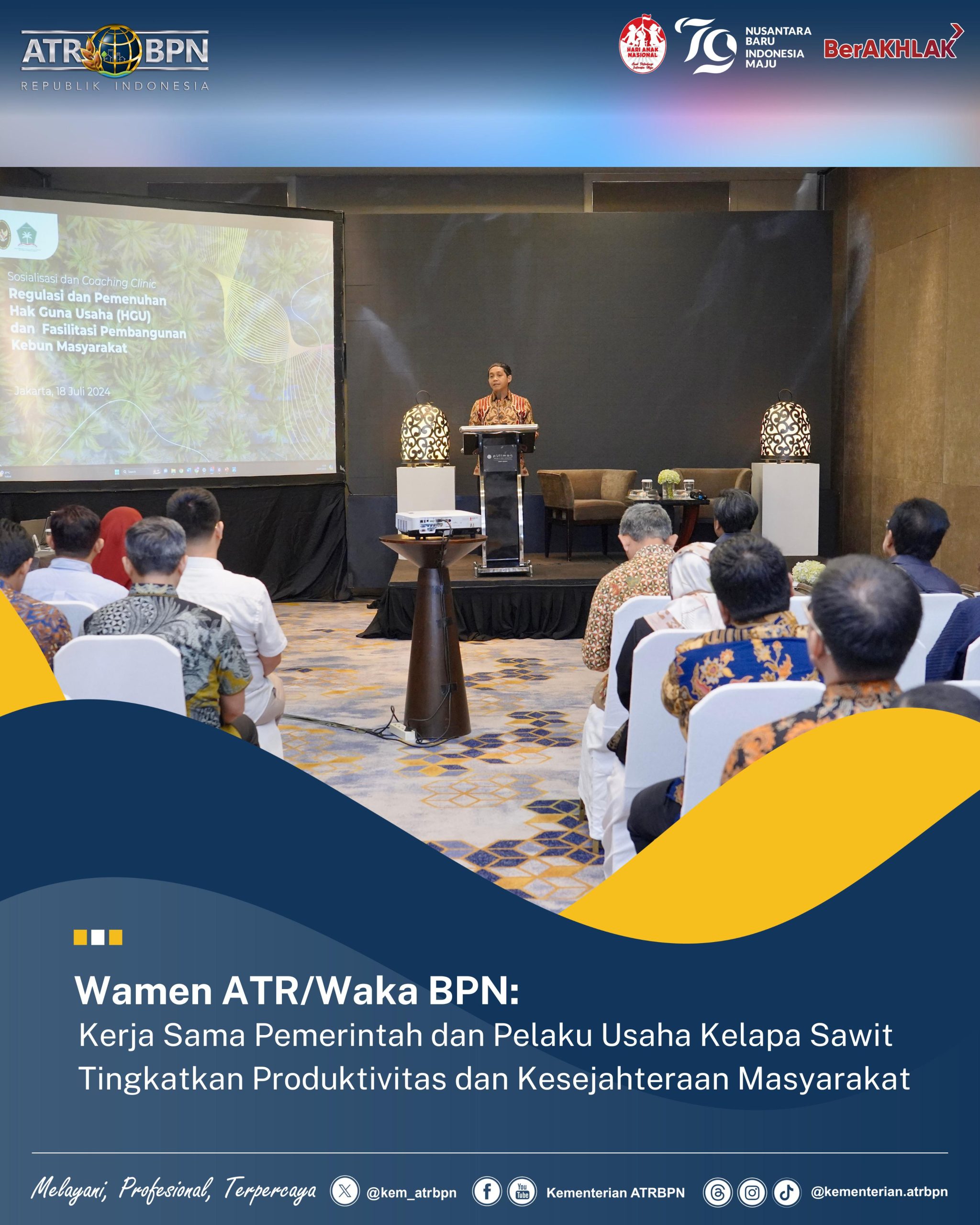Jakarta – Kerja sama pemerintah dan pelaku usaha komoditi kelapa sawit diharapkan akan meningkatkan produktivitas dan kesejahteraan masyarakat. Demikian disampaikan Wakil Menteri (Wamen) ATR/Wakil Kepala (Waka) BPN, Raja Juli Antoni dalam Sosialisasi dan _Coaching Clinic_ Regulasi serta Pemenuhan HGU dan Fasilitasi Pembangunan Kebun Masyarakat (FPKM) pada Kamis (18/07/2024) di Pullman Jakarta Hotel.