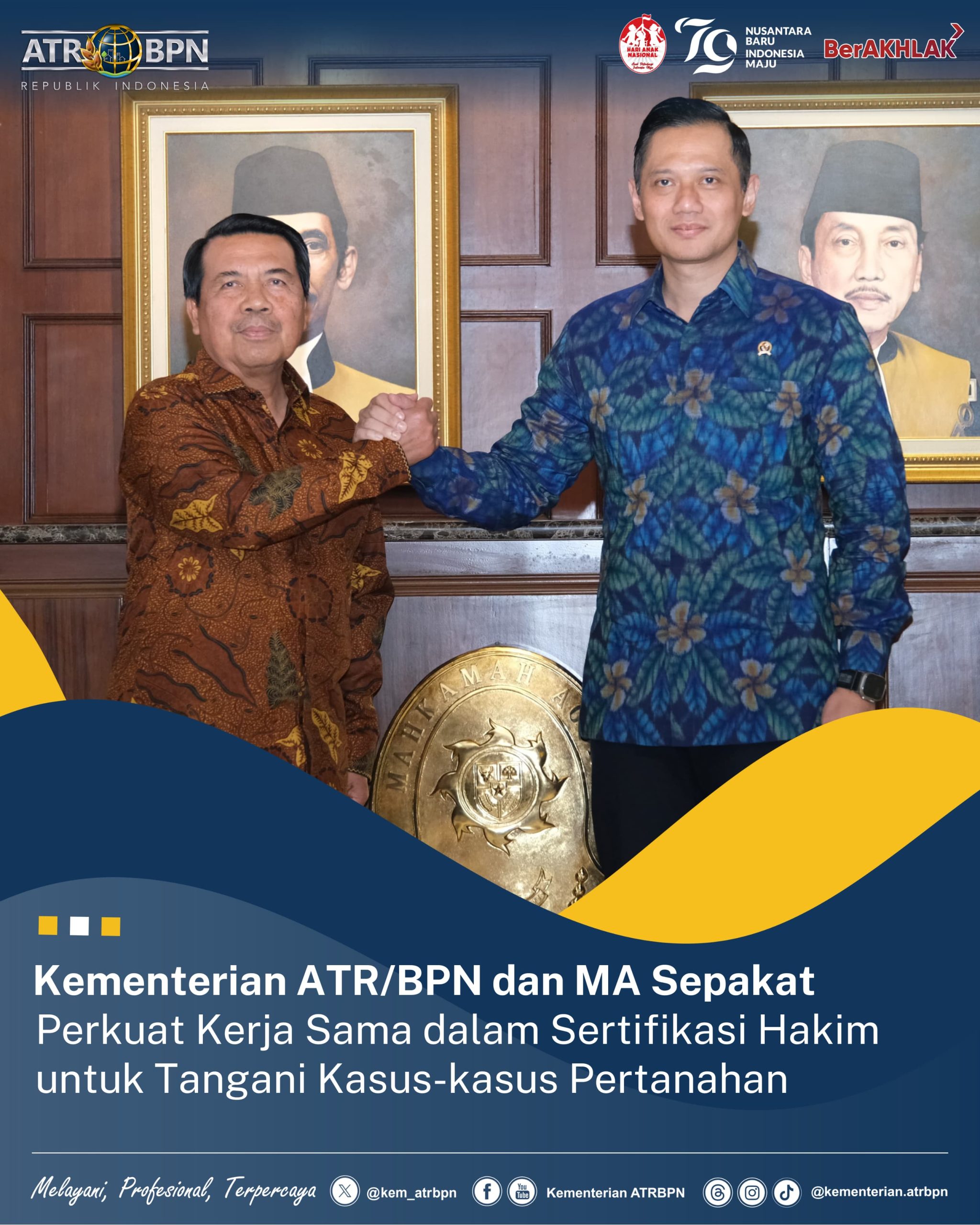 Lebih lanjut Menteri AHY menyampaikan, “Kami bermohon tentunya kepada Yang Mulia Ketua Mahkamah Agung dan jajaran termasuk yang ada di pusat dan daerah. Kita ingin agar penanganan sengketa dan konflik pertanahan ini benar-benar di _back up_ penuh oleh sistem peradilan yang juga _prudent_, transparan, akuntabel, dan adil,” ujarnya.