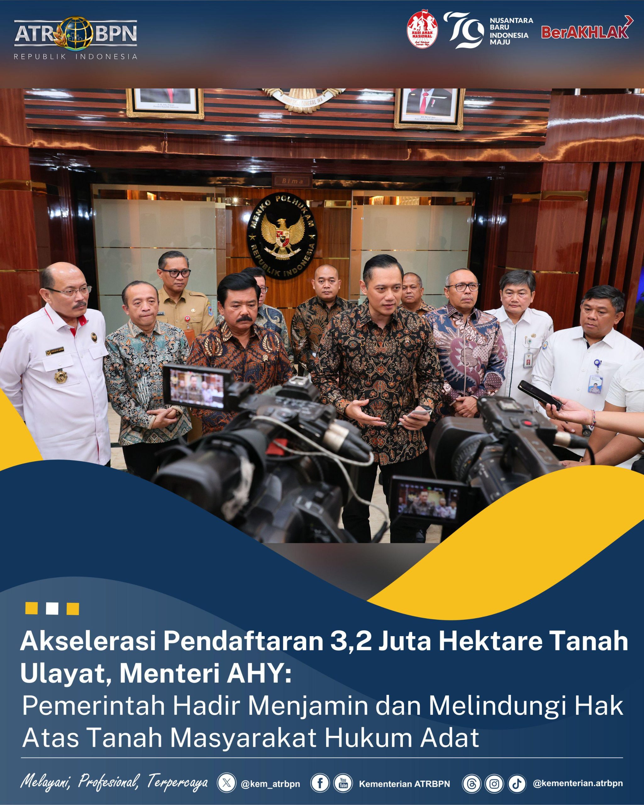 Akselerasi Pendaftaran 3,2 Juta Hektare Tanah Ulayat, Menteri AHY: Pemerintah Hadir Menjamin dan Melindungi Hak Atas Tanah Masyarakat Hukum Adat