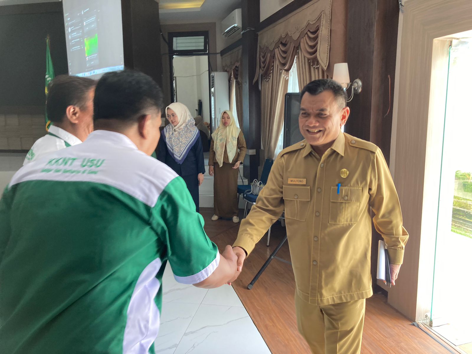 TEMPO86.COM //LANGKAT (SUMUT)_Penjabat (Pj) Bupati Langkat, H.M. Faisal Hasrimy, AP, M.AP, yang diwakilkan oleh Asisten Pemerintahan dan Kesejahteraan Rakyat, Drs. H. Mulyono, M.Si, menghadiri acara penarikan dan penjemputan mahasiswa KKNTR Universitas Sumatera Utara (USU) tahun 2024 di Ruang Pola Kantor Bupati Langkat, Senin (22/7/2024).