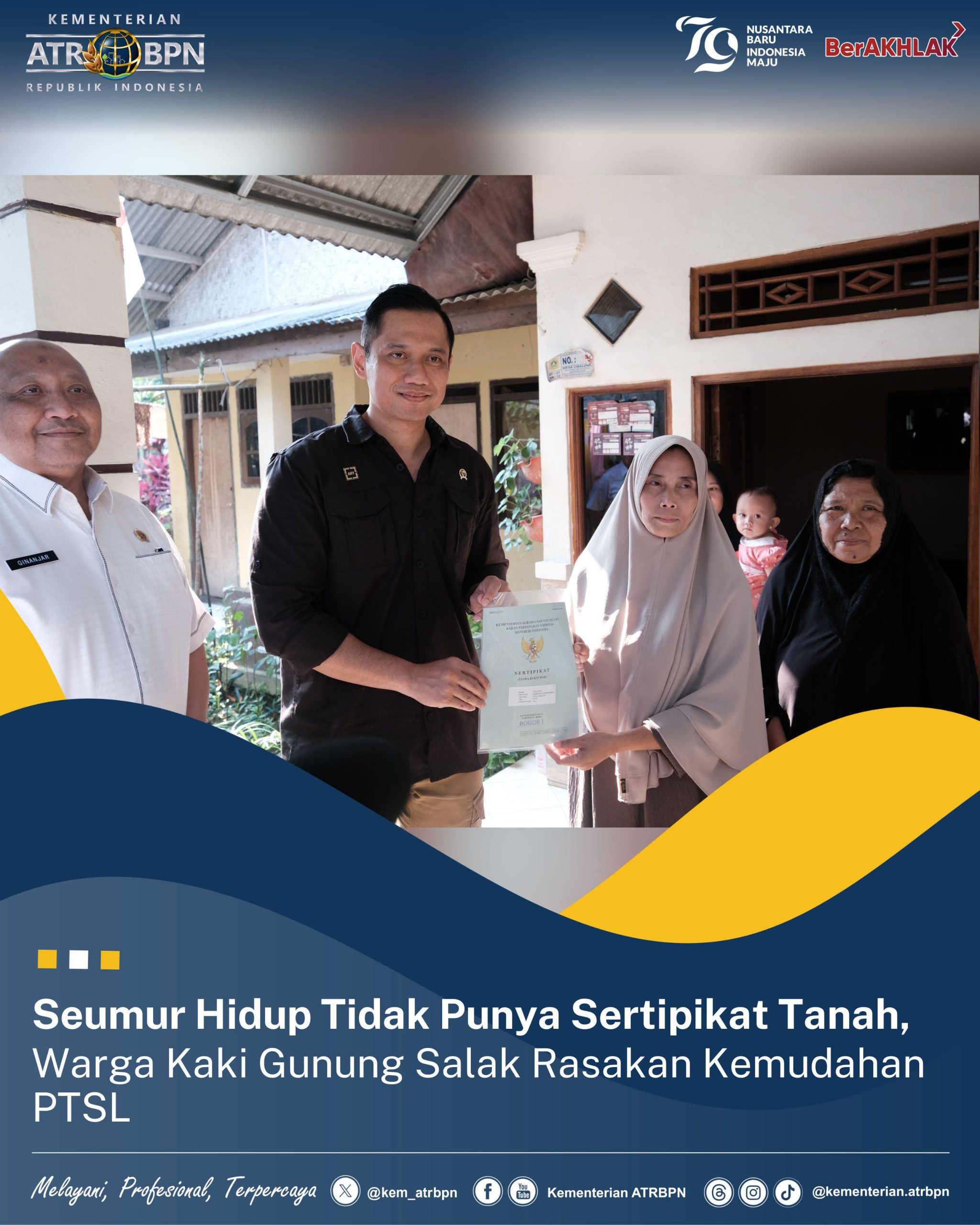 Namun, kini impian Ida Lestari untuk memiliki sertipikat tanah dapat terwujud berkat kemudahan proses dari program Pendaftaran Tanah Sistematis Lengkap (PTSL). “Sekarang bisa terhutang, jadi saya bisa punya dulu sertipikatnya, yang penting aman dulu tanah saya,” tuturnya.
