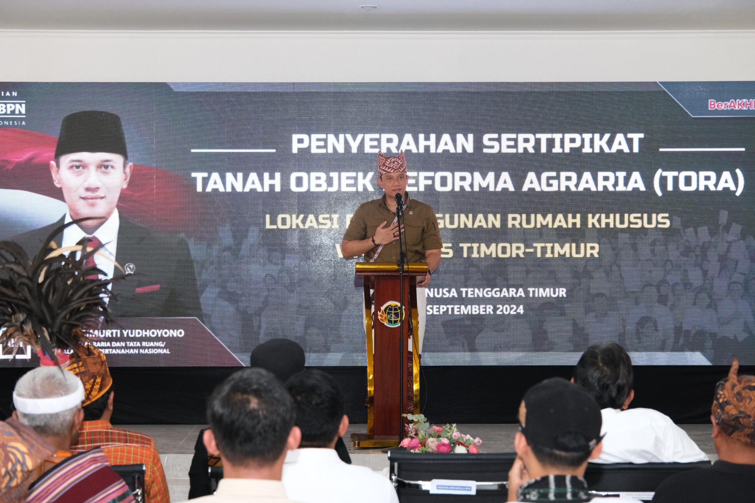 Kabupaten Kupang,Tempo86.com – Menteri Agraria dan Tata Ruang/Kepala Badan Pertanahan Nasional (ATR/BPN), Agus Harimurti Yudhoyono (AHY) menyerahkan sertipikat hasil dari program Redistribusi Tanah kepada masyarakat eks Timor Timur di Desa Oebola Dalam, Kecamatan Fatuleu, Kabupaten Kupang, Provinsi Nusa Tenggara Timur (NTT) pada Sabtu (14/08/2024). Dalam momen ini, ia pun teringat akan kenangan masa lalunya yang pernah menjadi bagian dari Timor Timur.