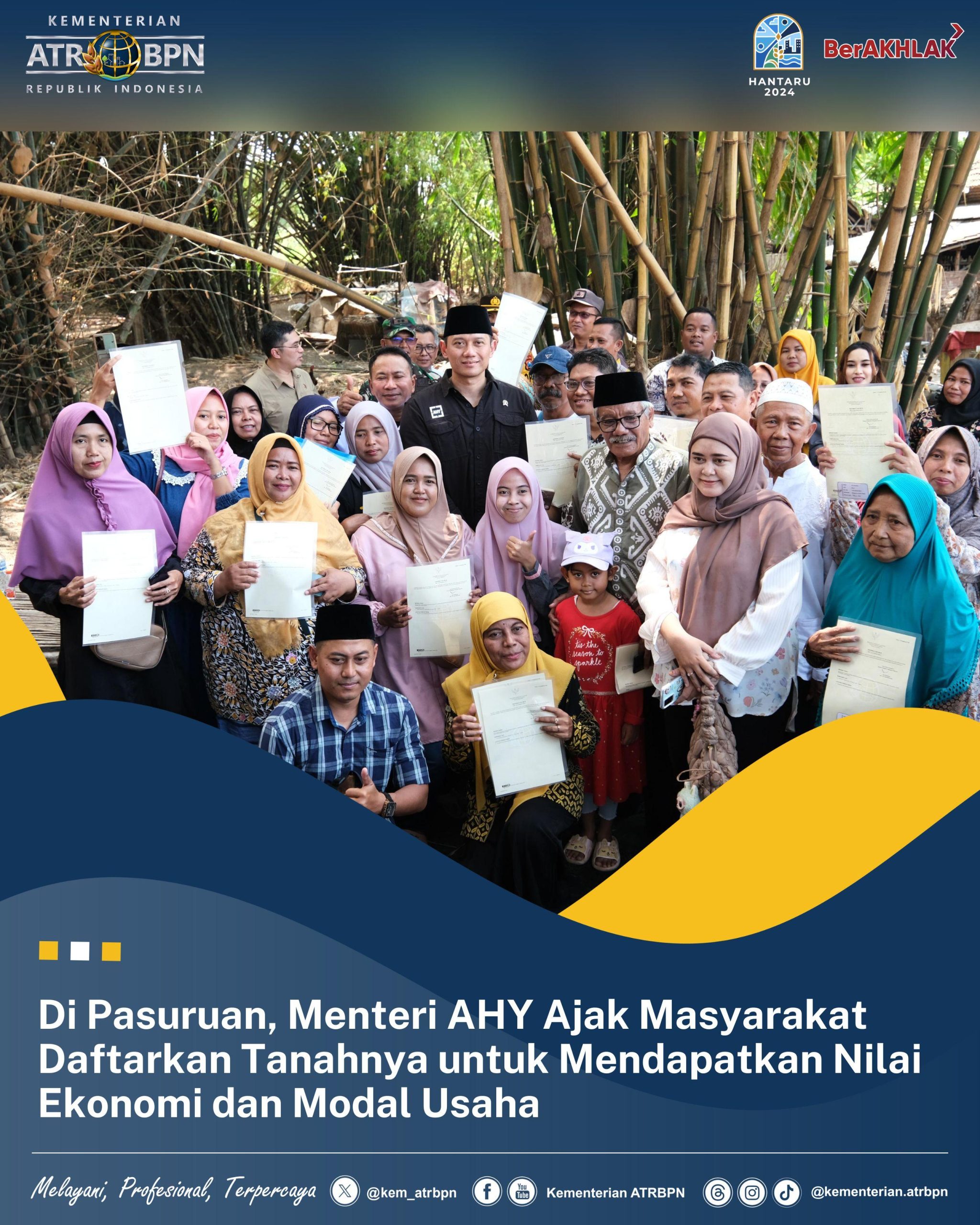 Pasuruan,Tempo86.com – Menteri Agraria dan Tata Ruang/Kepala Badan Pertanahan Nasional (ATR/BPN), Agus Harimurti Yudhoyono (AHY) mengajak masyarakat untuk mendaftarkan tanahnya agar mendapatkan nilai ekonomi dan modal usaha. Hal ini ia sampaikan saat menyerahkan 52 Sertipikat Tanah Elektronik hasil program Pendaftaran Tanah Sistematis Lengkap (PTSL) di Desa Ranggeh, Kecamatan Gondangwetan, Kabupaten Pasuruan, Kamis (26/09/2024).