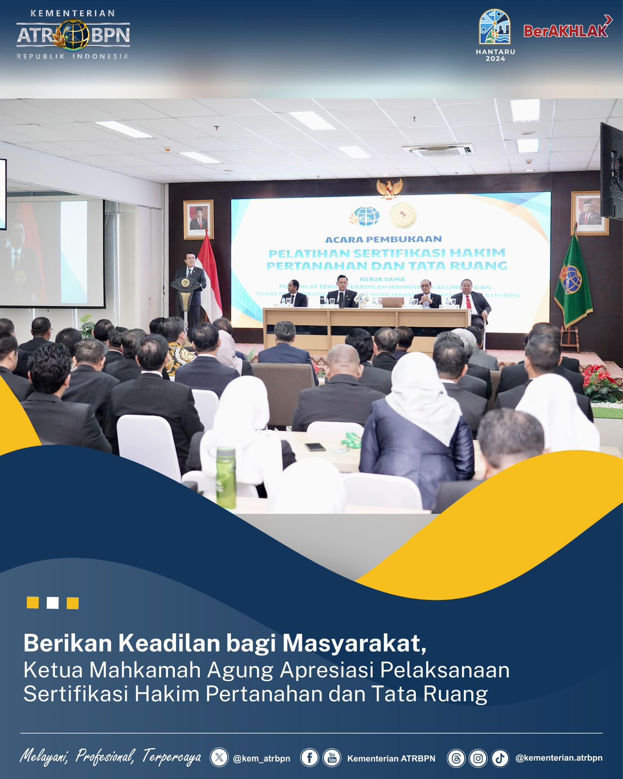 “Terima kasih kepada Pak Menteri beserta seluruh jajaran, kita berharap semua ini berjalan dengan baik dan pada akhirnya kita bisa mendapatkan hakim-hakim yang betul-betul mumpuni dalam hukum pertanahan dan tata ruang untuk memberikan pelayanan yang prima, pelayanan yang berkeadilan kepada para pencari keadilan,” ujar Ketua MA saat membuka Sertifikasi Hakim Pertanahan dan Tata Ruang di Aula PPSDM Kementerian ATR/BPN, Kabupaten Bogor, Rabu (02/10/2024).