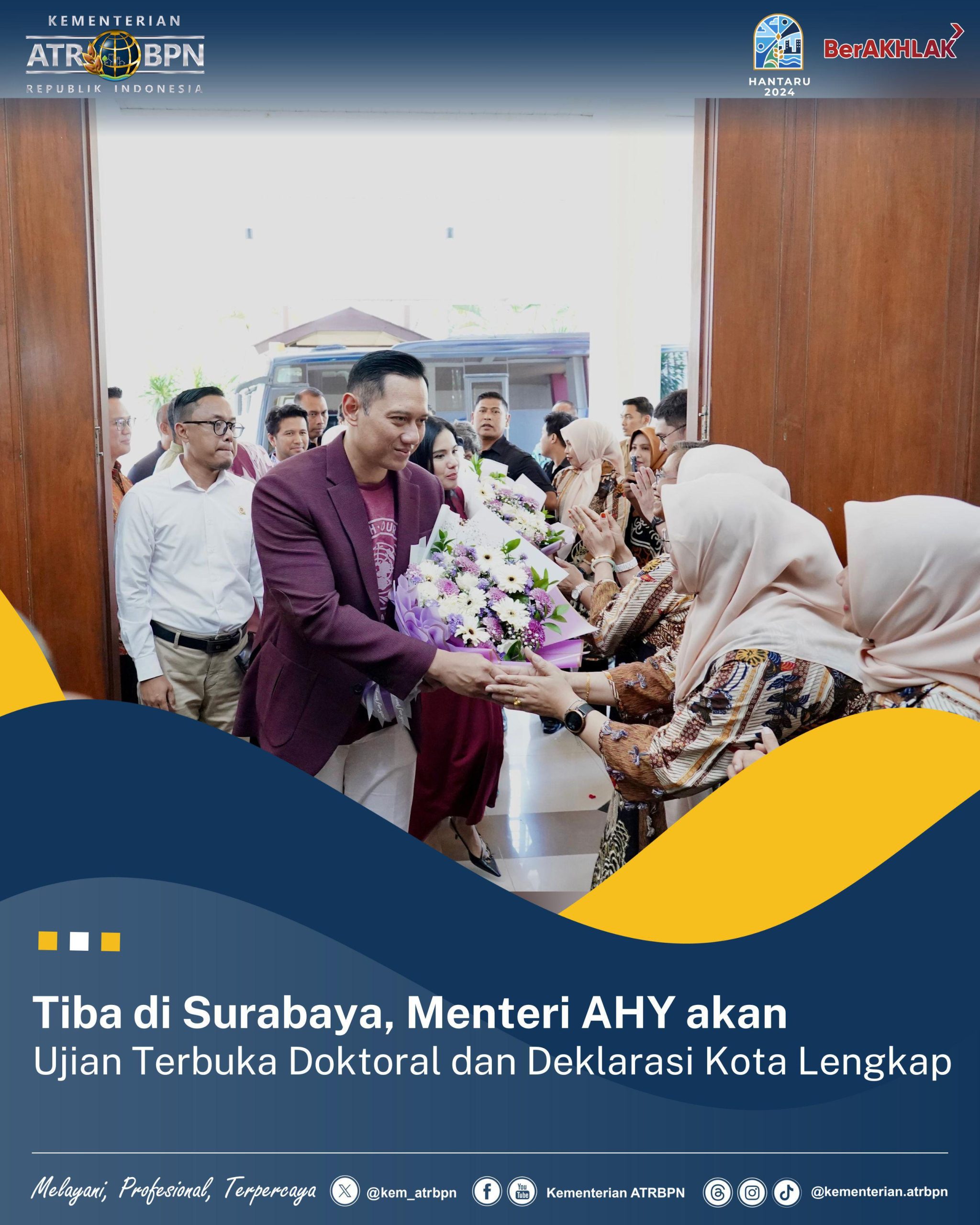 Surabaya,Tempo86.com – Menteri Agraria dan Tata Ruang/Kepala Badan Pertanahan Nasional (ATR/BPN), Agus Harimurti Yudhoyono (AHY) tiba di Surabaya, Jawa Timur pada Minggu (06/10/2024). Dalam kunjungannya kali ini, Menteri AHY akan menyelesaikan studi doktoralnya dengan mengikuti Ujian Doktor Terbuka pada Program Studi Pengembangan Sumber Daya Manusia, Sekolah Pascasarjana Universitas Airlangga.