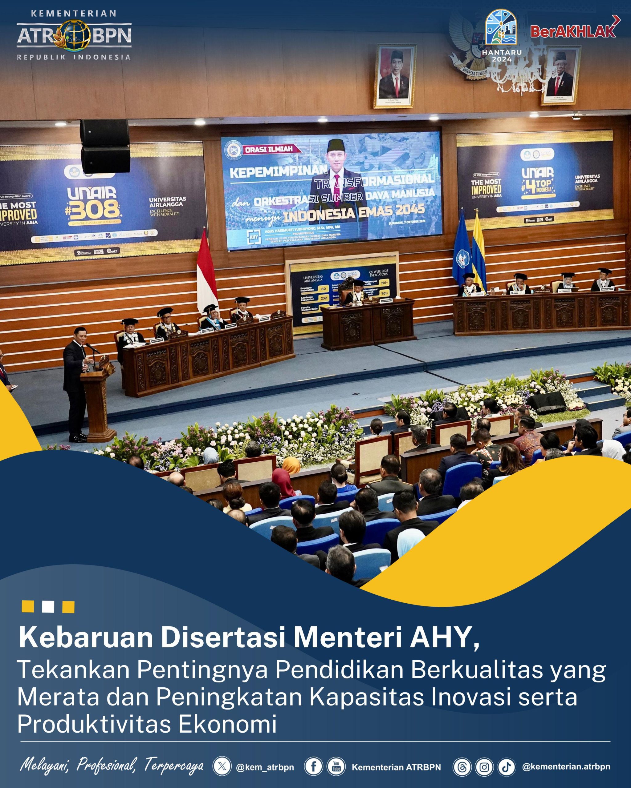 “_Novelty_ ini diharapkan akan memperkuat pelaksanaan UU 59/2024 tentang RPJPN 2025-2045, khususnya terkait misi 1 dan 2 dari 17 arah pembangunan yang berfokus pada transformasi sosial dan ekonomi. Menekankan pentingnya pendidikan berkualitas yang merata dan peningkatan kapasitas inovasi serta produktivitas ekonomi ke depan,” ungkap Menteri AHY dalam Ujian Doktor Terbuka yang berlangsung di Aula Garuda Mukti, Gedung Kantor Manajemen MERR C Mulyorejo, Universitas Airlangga, Senin (07/10/2024).