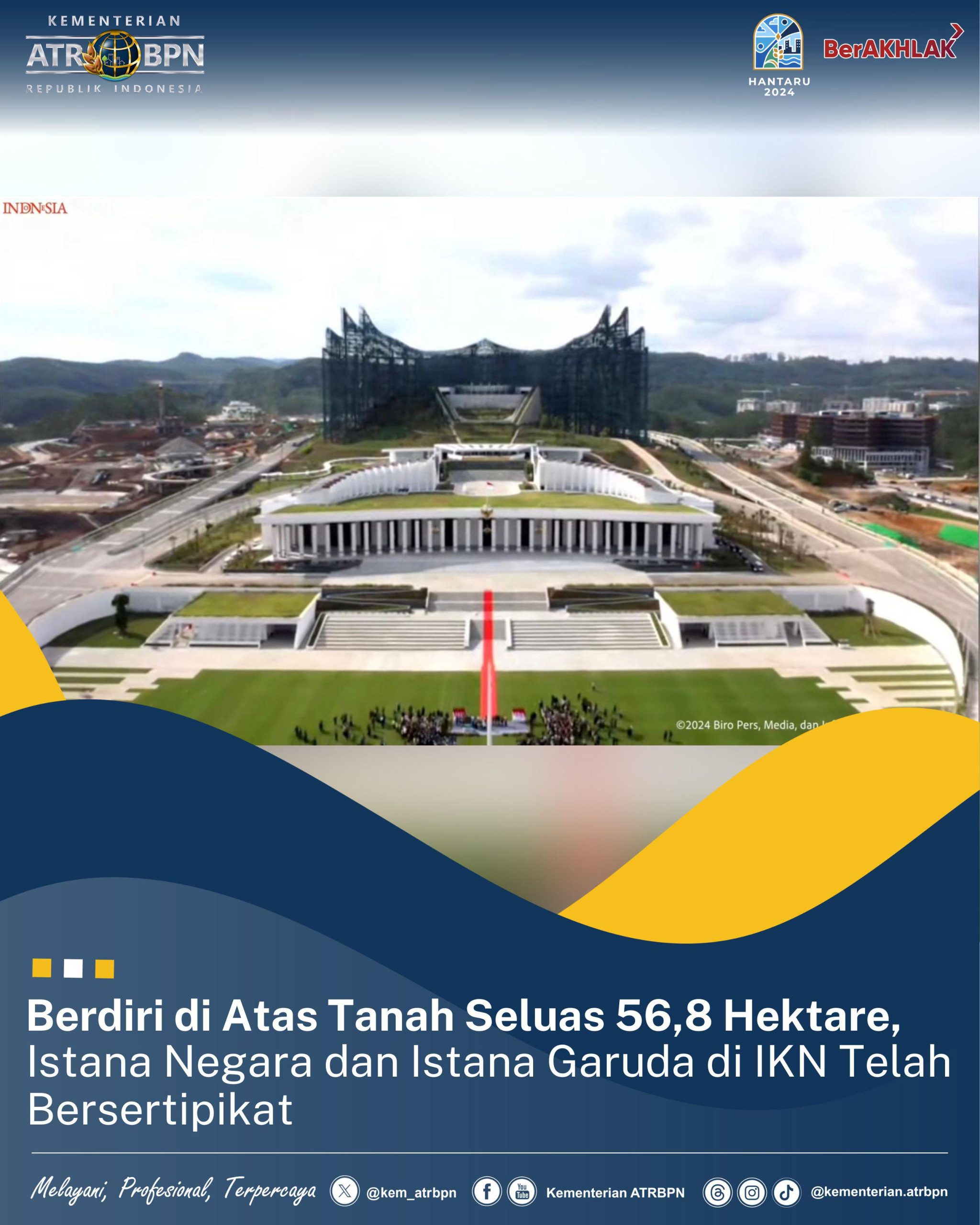 Nusantara,Tempo86.com – Istana Negara dan Istana Garuda yang menjadi kebanggaan bangsa Indonesia kini resmi bersertipikat. Sertipikat Tanah Elektronik berupa Hak Pakai telah diserahkan oleh Menteri Agraria dan Tata Ruang/Kepala Badan Pertanahan Nasional (ATR/BPN), Agus Harimurti Yudhoyono (AHY) kepada Menteri Sekretaris Negara, Pratikno dan disaksikan oleh Presiden Republik Indonesia, Joko Widodo (Jokowi), Jumat (11/10/2024).