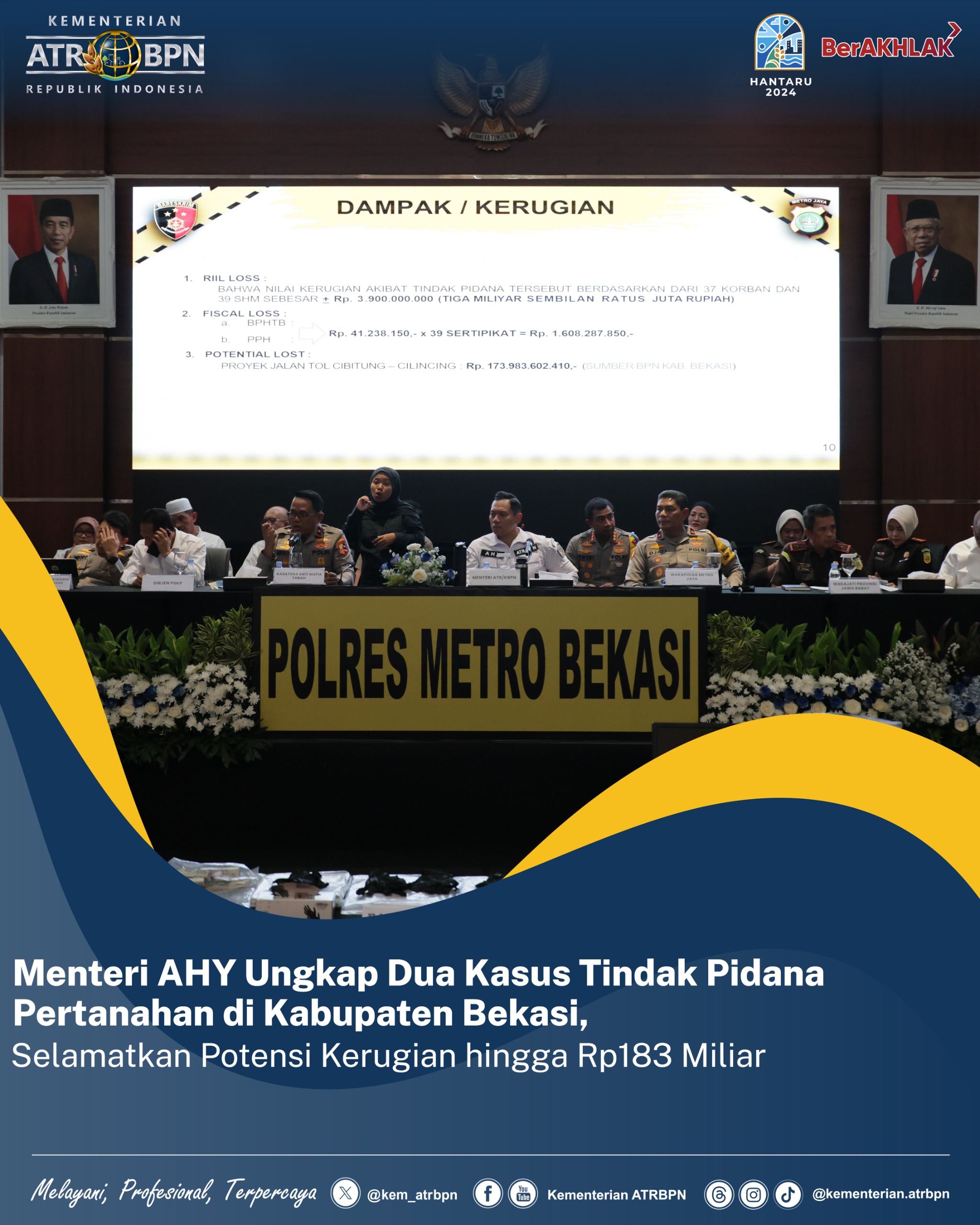 Kab. Bekasi,Tempo86.com – Menteri Agraria dan Tata Ruang/Kepala Badan Pertanahan Nasional (ATR/BPN), Agus Harimurti Yudhoyono (AHY) mengungkapkan dua kasus tindak pidana pertanahan yang terjadi di Kabupaten Bekasi. Dari kasus yang diungkapkan, total potensi nilai kerugian negara dan masyarakat yang diselamatkan mencapai Rp183.563.890.260.