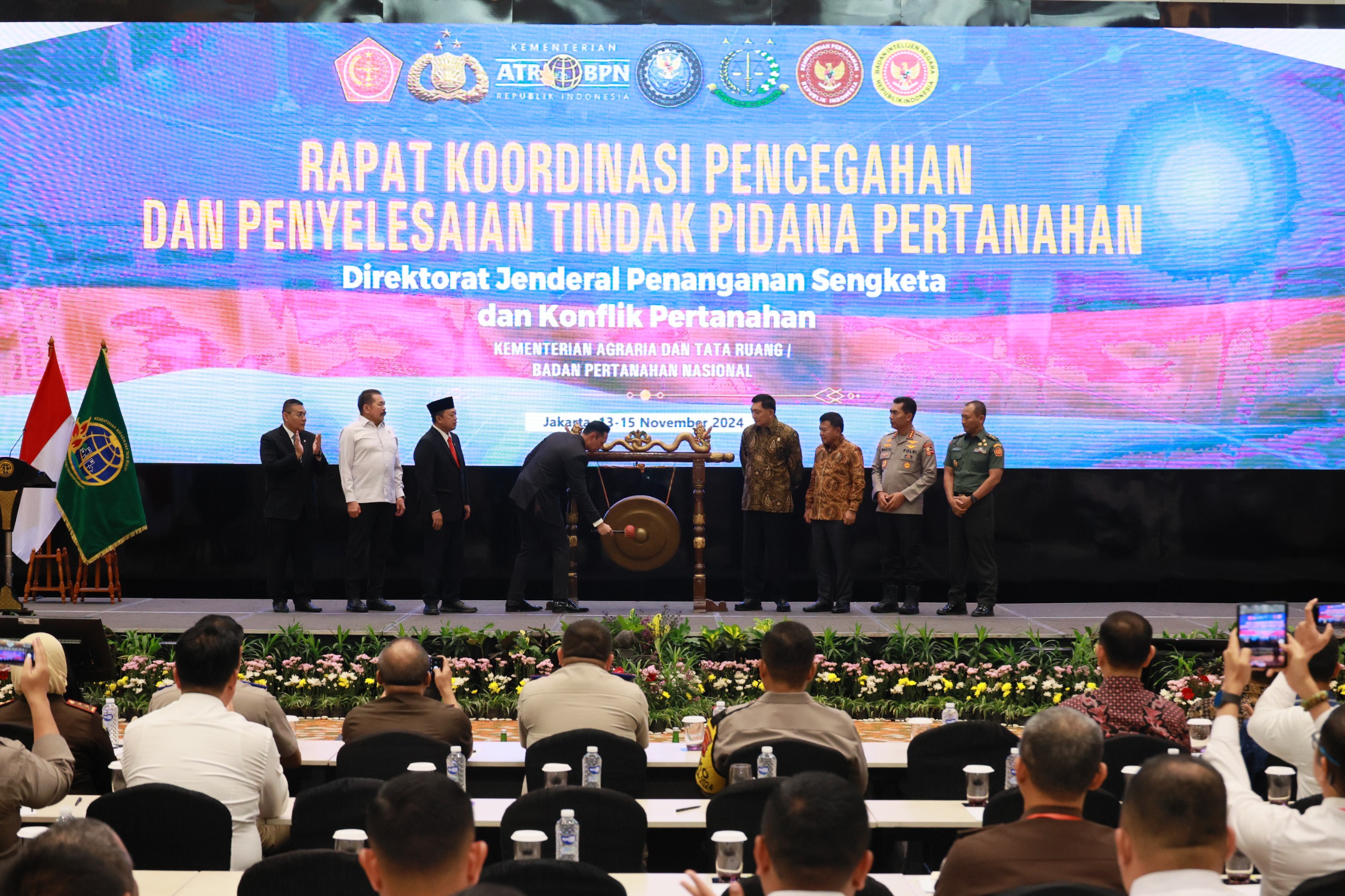 Jakarta,Tempo86.com – Menteri Koordinator Bidang Infrastruktur dan Pembangunan Kewilayahan, Agus Harimurti Yudhoyono (AHY) membuka Rapat Koordinasi (Rakor) Penyelesaian Tindak Pidana Pertanahan Tahun 2024 yang ditandai dengan pemukulan gong pada Kamis (14/11/2024), di Grand Mercure Kemayoran, Jakarta. Dalam sambutannya, Menko AHY menyampaikan bahwa Kementerian Agraria dan Tata Ruang/Badan Pertanahan Nasional (ATR/BPN) menunjukkan komitmen menyelesaikan persoalan pertanahan, dengan tidak tebang pilih dalam proses penyelesaiannya.