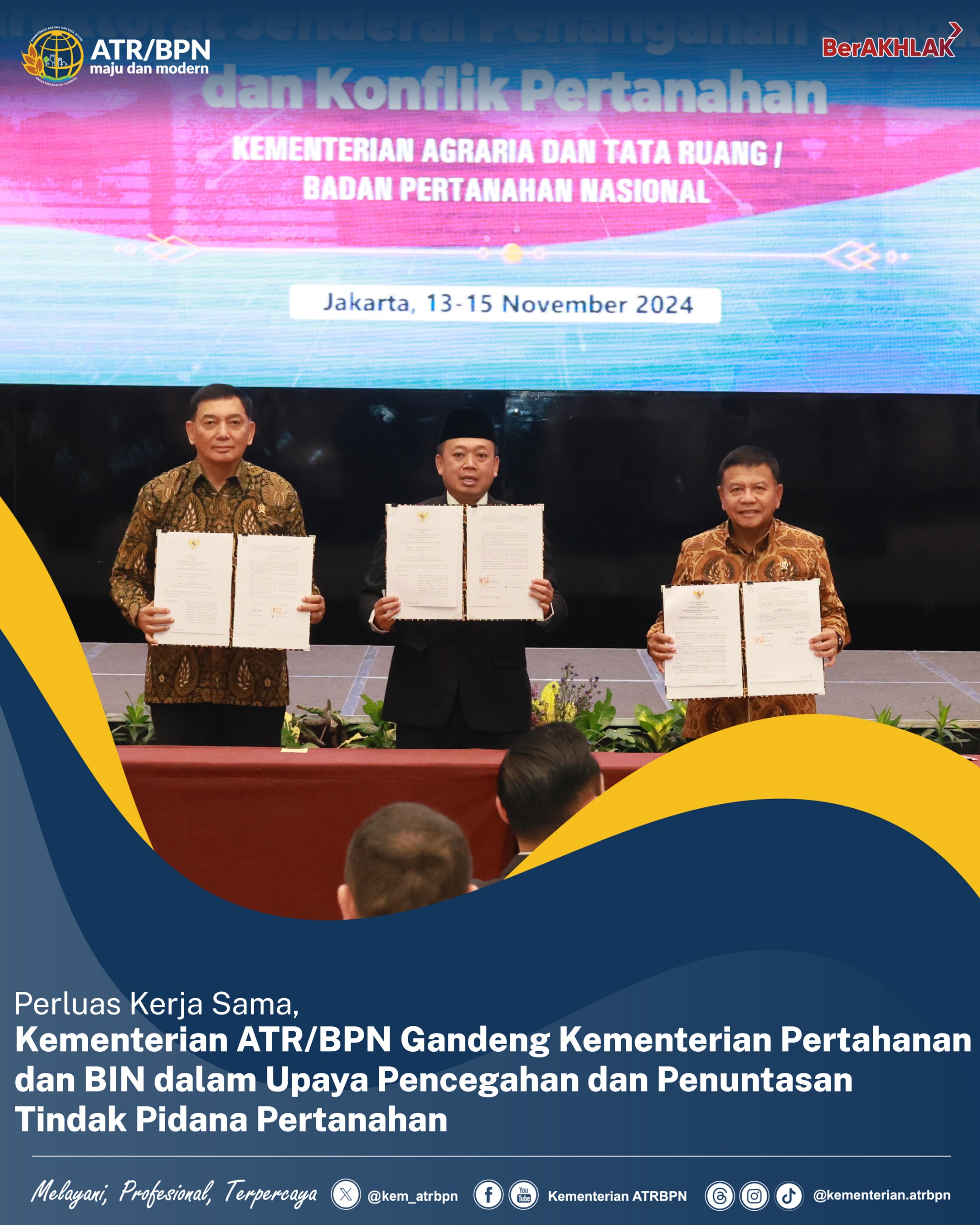Jalinan kerja sama tersebut diresmikan dengan penandatanganan _Memorandum of Understanding_ (MoU) oleh Menteri ATR/Kepala BPN, Nusron Wahid dengan Menteri Pertahanan, Sjafrie Sjamsoeddin dan Kepala BIN, Muhammad Herindra.
