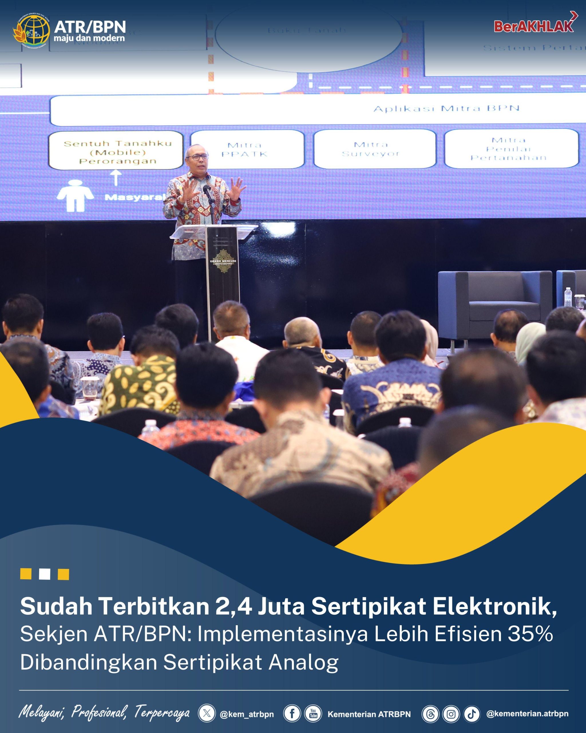 Jakarta,Tempo86.com – Sejak diluncurkan pada Desember 2023 lalu, 2,4 juta Sertipikat Elektronik sudah berhasil diterbitkan dan dapat mengefisiensi hingga lebih dari 35% waktu penerbitan sertipikat tanah. Hal tersebut disampaikan Sekretaris Jenderal (Sekjen) Kementerian Agraria dan Tata Ruang/Badan Pertanahan Nasional (ATR/BPN), Suyus Windayana saat membuka Monitoring dan Evaluasi Implementasi Penerbitan Dokumen Elektronik pada Layanan Pertanahan Tahun 2024, Kamis (28/11/2024).