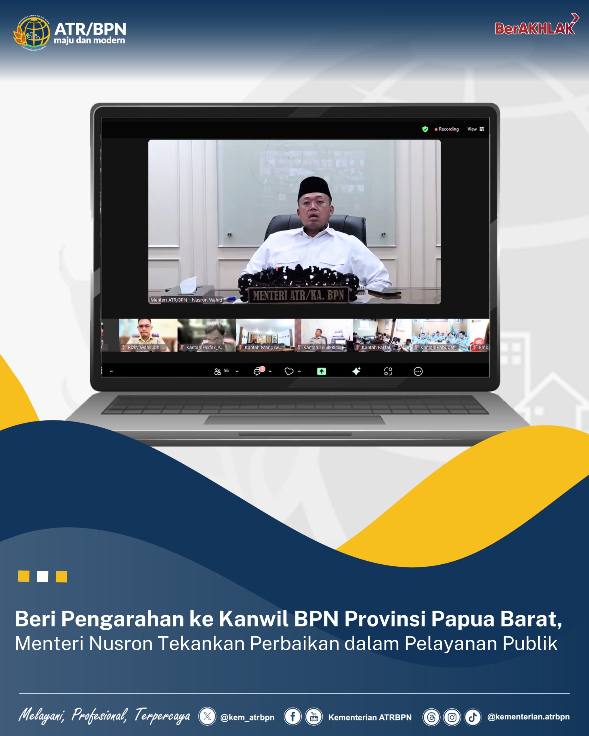 Jakarta,Tempo86.com – Menteri Agraria dan Tata Ruang/Kepala Badan Pertanahan Nasional (ATR/BPN), Nusron Wahid memberikan pengarahan untuk pertama kali ke jajaran Kantor Wilayah (Kanwil) BPN Provinsi Papua Barat, Senin (02/12/2024) via daring. Ia berkenalan sekaligus menekankan agar jajaran memberikan pelayanan terbaik bagi masyarakat.