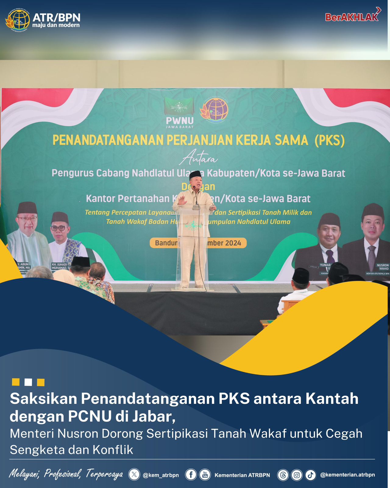 “Memang (sertipikasi tanah wakaf, red) ini dianjurkan, jadi kalau ada pesantren yang belum bersertipikat langsung didaftarkan saja sehingga tidak ada konflik,” ucap Nusron Wahid usai menyaksikan penandatanganan Perjanjian Kerja Sama (PKS) antara 25 Kantor Pertanahan (Kantah) Kabupaten/Kota se-Jawa Barat dengan Pengurus Cabang Nahdlatul Ulama (PCNU) di wilayah terkait, yang berlangsung di Kantor PWNU Jawa Barat, Bandung, Kamis (05/12/2024).