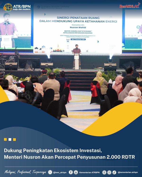 “Mohon maaf sebelumnya memang urusan KKPR ini bisa dikatakan cukup ruwet karena di dalam regulasinya mengatakan harus menggunakan basis RDTR, dan dalam RDTR itu basisnya adalah peta 1:5.000 yang programnya disebut dengan One Map Policy. Targetnya RDTR itu ada 2.000, sekarang ini baru 567, masih kurang sekitar 1.400. Kami harus melakukan percepatan, tapi kami sudah punya solusi,” ungkap Nusron Wahid dalam sambutannya di Closing Meeting dan Koordinasi Kementerian Terkait Perizinan Pertamina Group 2024, di Hotel Intercontinental Jimbaran, Bali, Jumat (13/12/2024).