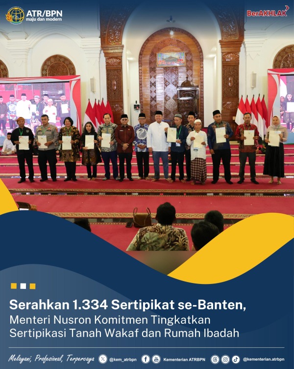 Serahkan 1.334 Sertipikat se-Banten, Menteri Nusron Komitmen Tingkatkan Sertipikasi Tanah Wakaf dan Rumah Ibadah