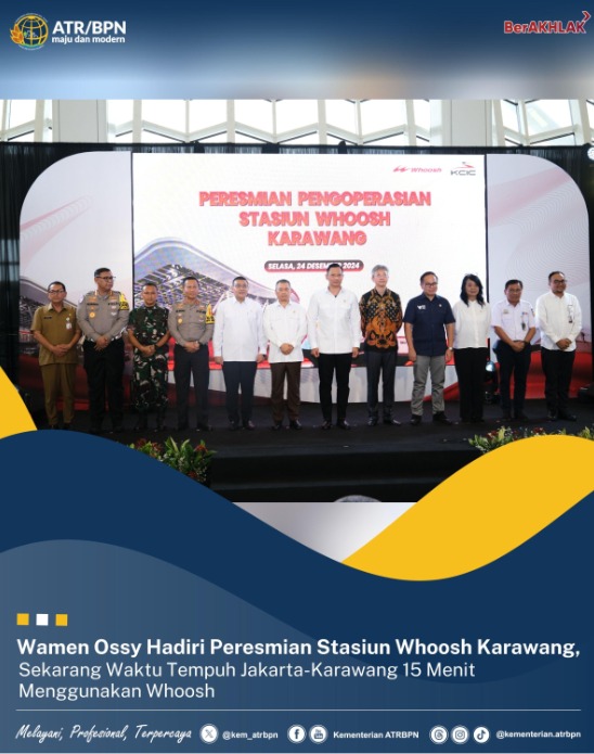 Tempo86.com // Wakil Menteri Agraria dan Tata Ruang (Wamen ATR)/Wakil Kepala Badan Pertanahan Nasional (Waka BPN), Ossy Dermawan hadir di Peresmian Pengoperasian Stasiun Whoosh Karawang pada Selasa (24/12/2024). Pengoperasian Stasiun Whoosh Karawang diresmikan secara langsung oleh Menteri Koordinator (Menko) Bidang Infrastruktur dan Pembangunan Kewilayahan, Agus Harimurti Yudhoyono (AHY).