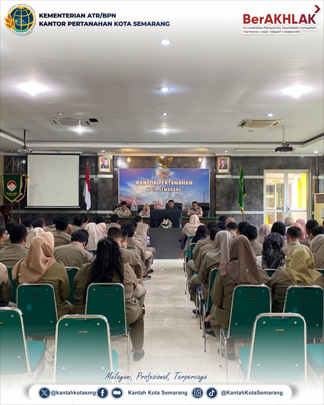 Kegiatan Pengarahan dan Evaluasi Kinerja Pegawai Pemenerintah Non Pegawai Negeri (PPNPN) berlangsung di ruang Aula Sepenuh Hati Kantor Pertanahan Kota Semarang, Selasa (31/12/2024). Kegiatan ini diikuti oleh seluruh PPNPN dari semua seksi dan subbagian di lingkungan Kantor Pertanahan Kota Semarang.