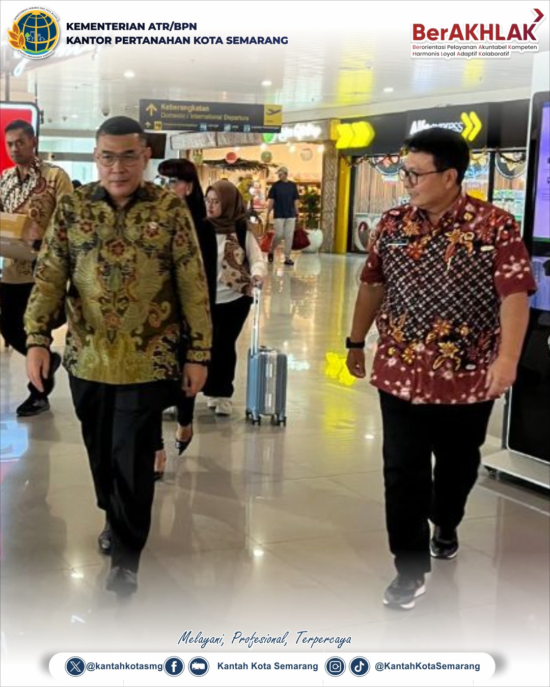 Tempo86.com // Kepala Kantor Pertanahan Kota Semarang, Rudi Prihantoro, A.Ptnh., M.M., M.H. QRMP. menyambut hangat kedatangan Wakil Menteri ATR/Wakil Kepala BPN, Ossy Dermawan di Bandara Internasional Jenderal Ahmad Yani, Jumat (03/01/2025). Kunjungan Ossy Dermawan tersebut sekaligus menjadi kunjungan kerja pertama di tahun 2025. Dalam agenda kunjungan di Jawa Tengah tersebut, Wakil Menteri ATR/Wakil Kepala BPN mengunjungi Kantor Pertanahan Kabupaten Semarang.