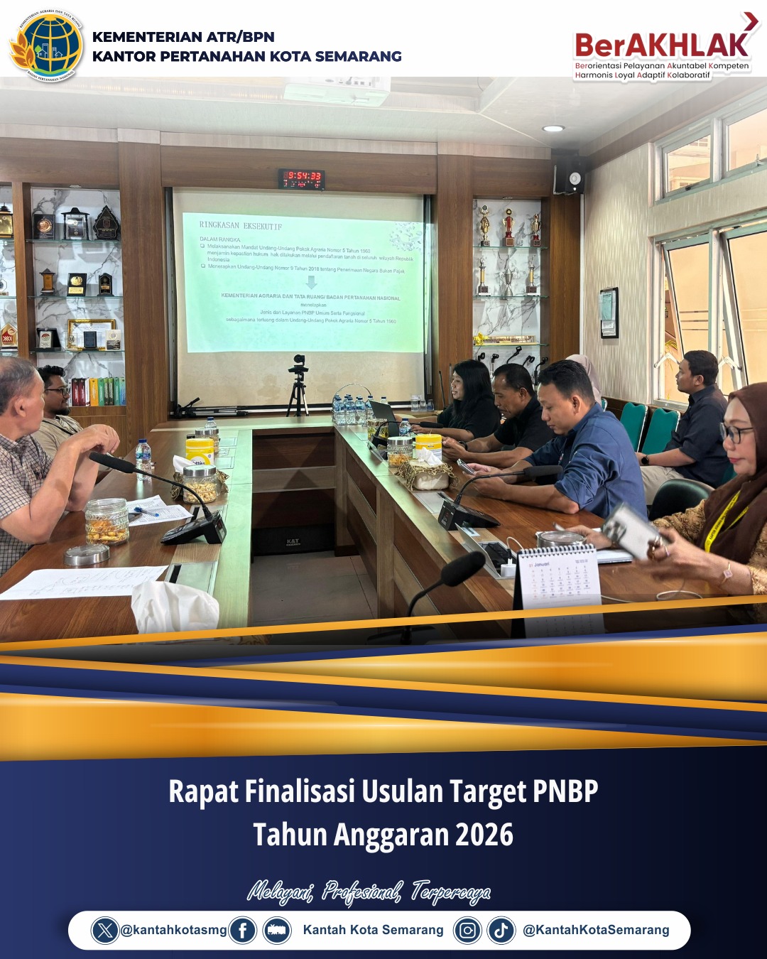 Rapat Finalisasi Usulan Target PNBP Tahun Anggaran 2026 berlangsung di ruang rapat Kantor Pertanahan Kota Semarang, Jumat (03/01/2025). Rapat digelar sebagai tindaklanjut pengisian Usulan Target PNBP dan Target Belanja Daerah Tahun Anggaran 2026. Dalam rapat tersebut dibahas Usulan Rencana Program, Kegiatan dan Penganggaran Tahun Anggaran 2026.