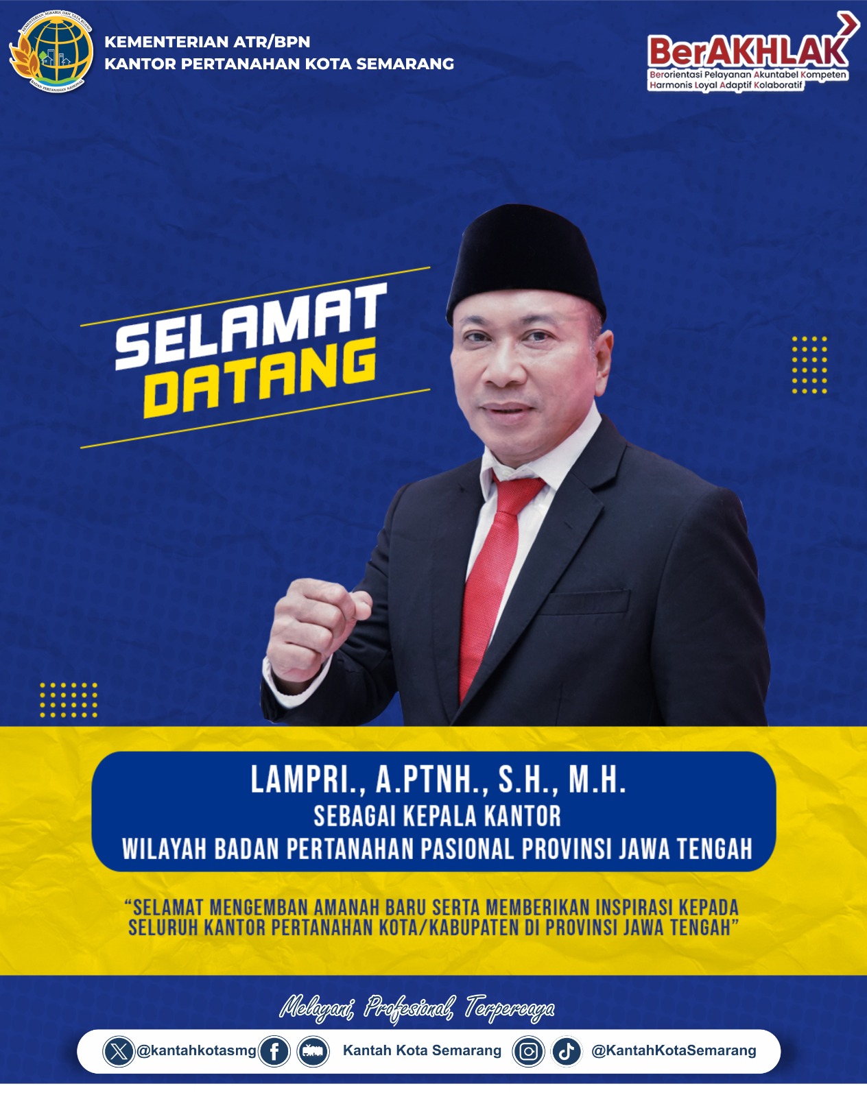 Segenap Keluarga Besar Kantor Pertanahan Kota Semarang mengucapkan selamat atas dilantiknya Bapak Lampri., A.Ptnh., S.H., M.H. sebagai Kakanwil BPN Provinsi Jawa Tengah