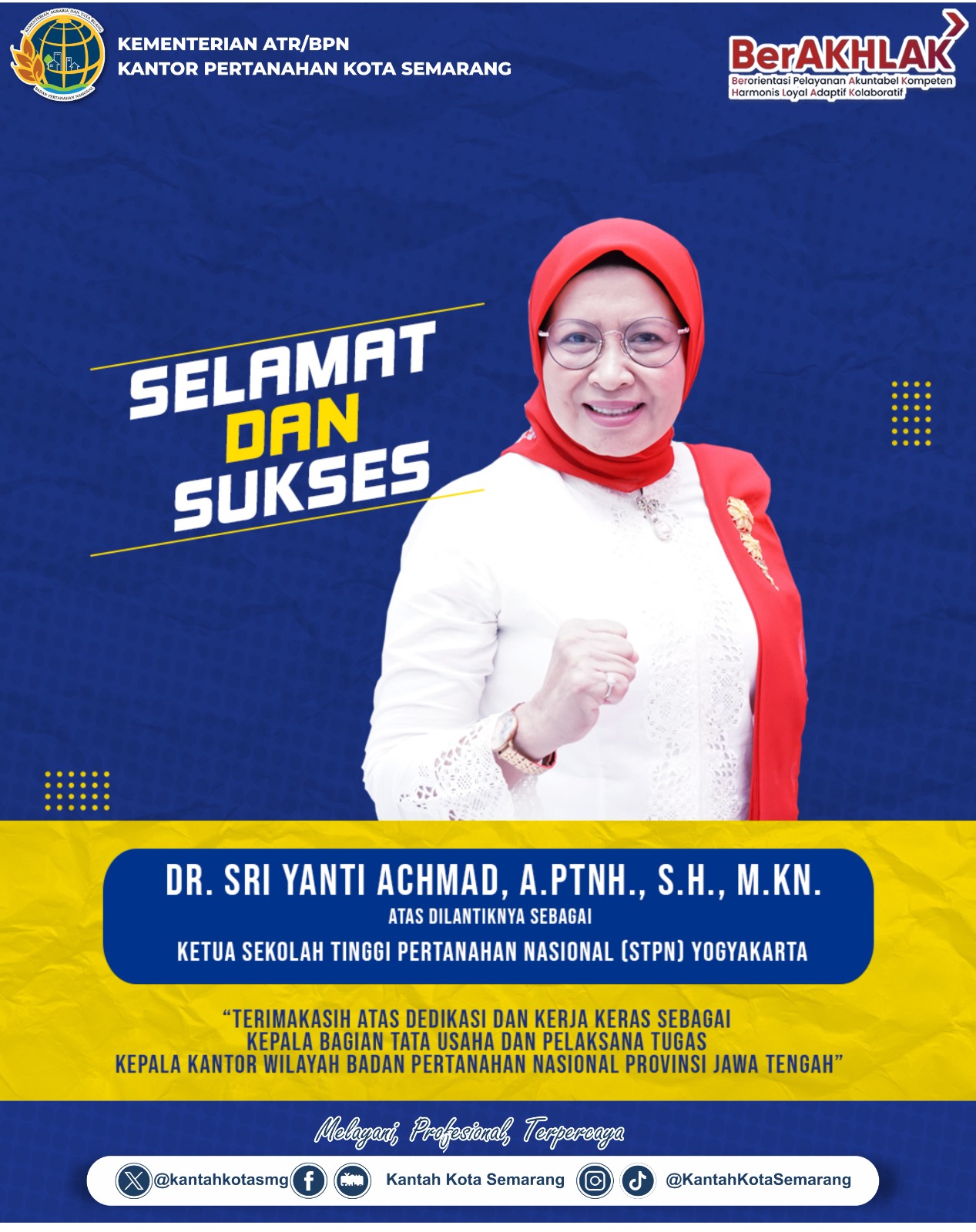 Kota Semarang , Tempo86.com // Segenap Keluarga Besar Kantor Pertanahan Kota Semarang mengucapkan terimakasih atas segala bimbingan serta arahannya selama ini dan selamat atas dilantiknya Ibu Dr. Sri Yanti Achmad, A.Ptnh., S.H., M.Kn. sebagai Ketua Sekolah Tinggi Pertanahan Nasional.