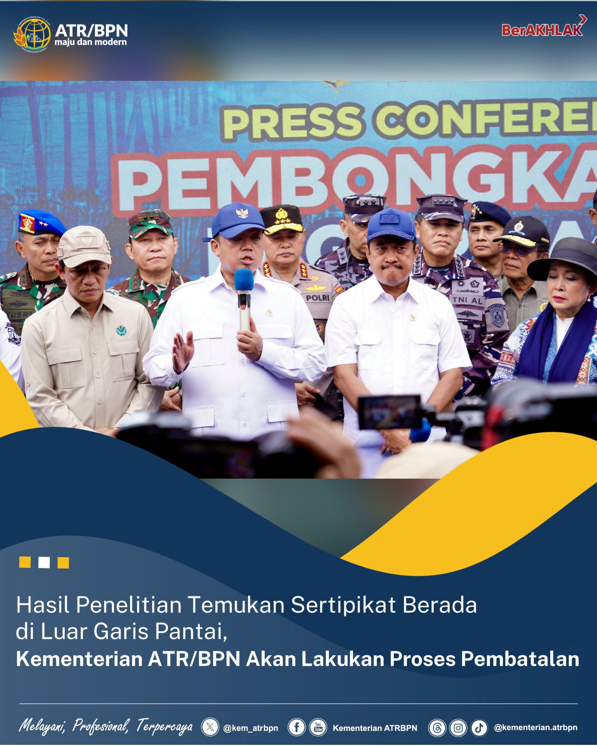 Jakarta – Kementerian Agraria dan Tata Ruang/Badan Pertanahan Nasional (ATR/BPN) masih terus menginvestigasi permasalahan di Desa Kohod, Kabupaten Tangerang, Provinsi Banten. Dari hasil penelusuran sementara, ditemukan sejumlah sertipikat yang berada di luar garis pantai. Terhadap sertipikat tersebut, Kementerian ATR/BPN akan melakukan tinjauan ulang untuk pencabutan.