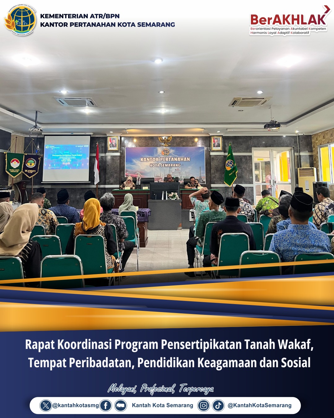 Rapat Rapat koordinasi Program Pensertipikatan tanah wakaf, tempat peribadatan, pendidikan keagamaan dan sosial (i’tikaf ibadah) di Kota Semarang berlangsung di Aula Sepenuh Hati Kantor Pertanahan Kota Semarang, Kamis (13/02/2025).
