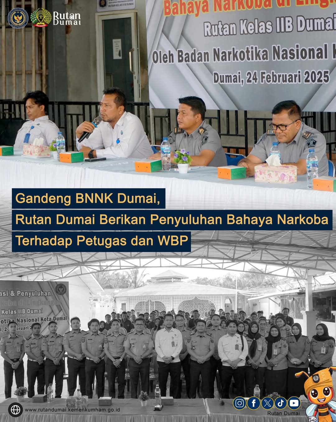 DUMAI (RIAU) TEMPO86.COM//Rumah Tahanan Negara (Rutan) Kelas IIB Dumai bekerjasama dengan Badan Narkotika Nasional Kota (BNNK) Dumai menggelar kegiatan penyuluhan tentang bahaya penyalahgunaan narkoba bagi petugas dan warga binaan di lapangan serbaguna Rutan, Senin (24/02/2025).