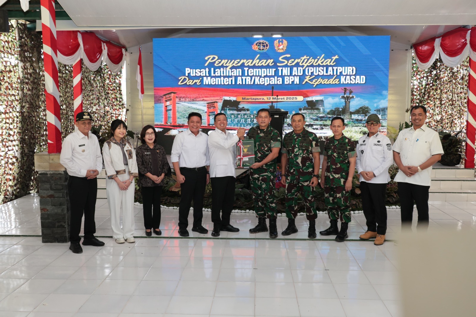 OKU Timur – Menteri Agraria dan Tata Ruang/Kepala Badan Pertanahan Nasional (ATR/BPN), Nusron Wahid, menyerahkan 42 sertipikat untuk Pusat Latihan Tempur (Puslatpur) Komando Pembina Doktrin, Pendidikan, dan Latihan Tentara Nasional Indonesia Angkatan Darat (Kodiklat TNI AD) di Aula Puslatpur, Kabupaten Ogan Komering Ulu (OKU) Timur, Rabu (12/03/2025). Total luas Sertipikat Hak Pakai atas nama Pemerintah Republik Indonesia c.q. Kementerian Pertahanan ini, mencapai 32.782,5 hektare yang artinya Puslatpur ini menjadi yang terluas di Asia.