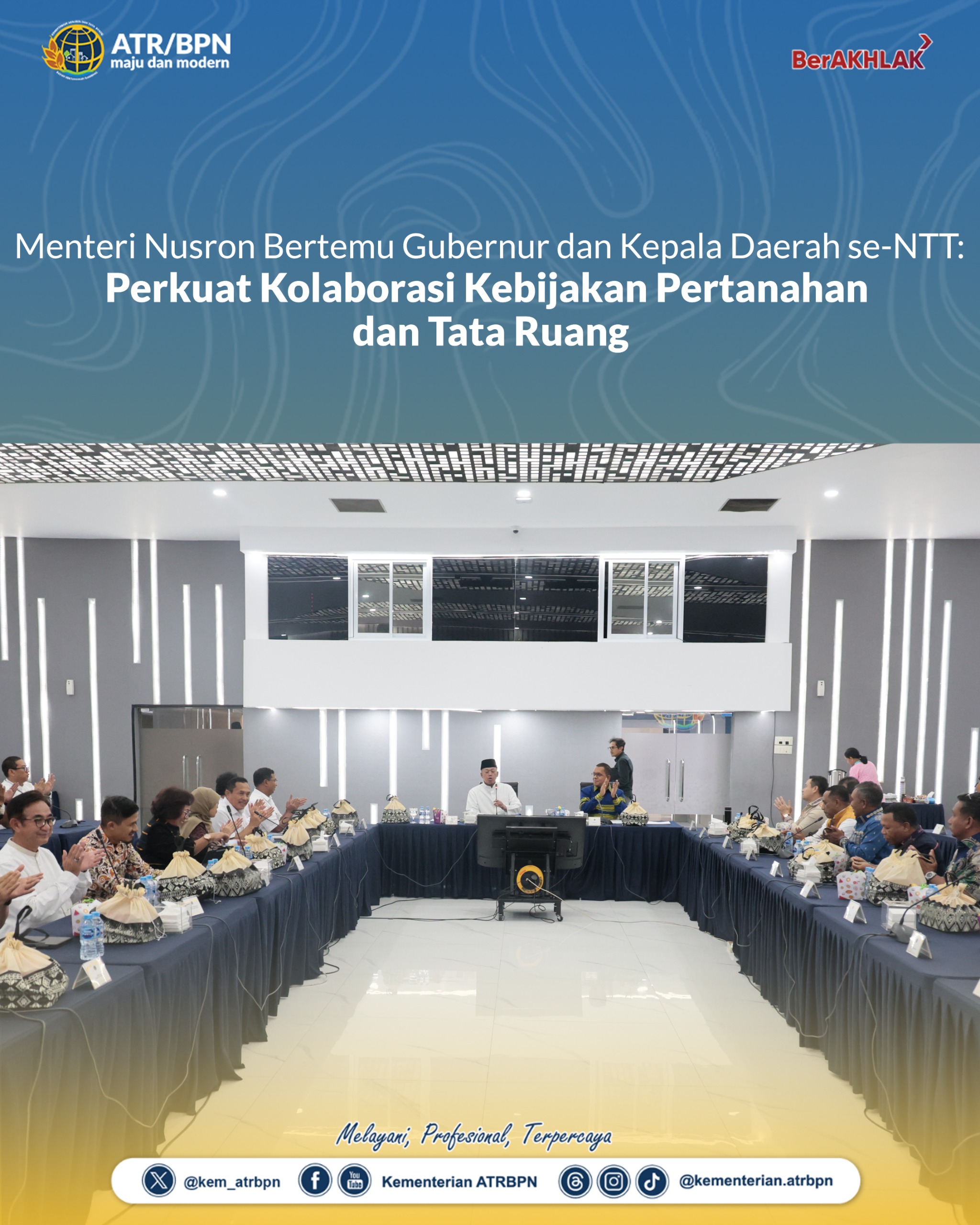 Lebih lanjut, Menteri Nusron menjelasakan kepada Gubernur dan Kepala Daerah se-NTT yang hadir bagaimana peran Pemda dalam mendukung _modern land administration paradigm_ yang mencakup _land tenure, land value, land use, land development,_ hingga _cadastre_. Dengan kolaborasi yang terjalin antara pemerintah pusat dan daerah, ia berharap dapat menjadi kunci dalam modernisasi administrasi pertanahan serta optimalisasi tata ruang di NTT.