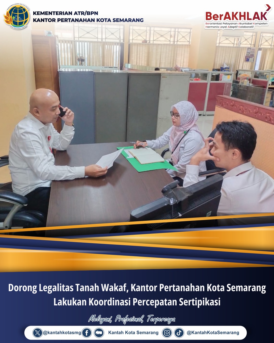 Semarang – Kantor Pertanahan Kota Semarang terus menunjukkan komitmennya dalam mendukung percepatan sertipikasi tanah wakaf di wilayah Kota Semarang. Sebagai langkah konkret, perwakilan dari Kantah Kota Semarang melakukan kegiatan koordinasi dan konsultasi ke Kantor Wilayah Badan Pertanahan Nasional (BPN) Provinsi Jawa Tengah pada Rabu (23/04/2025).