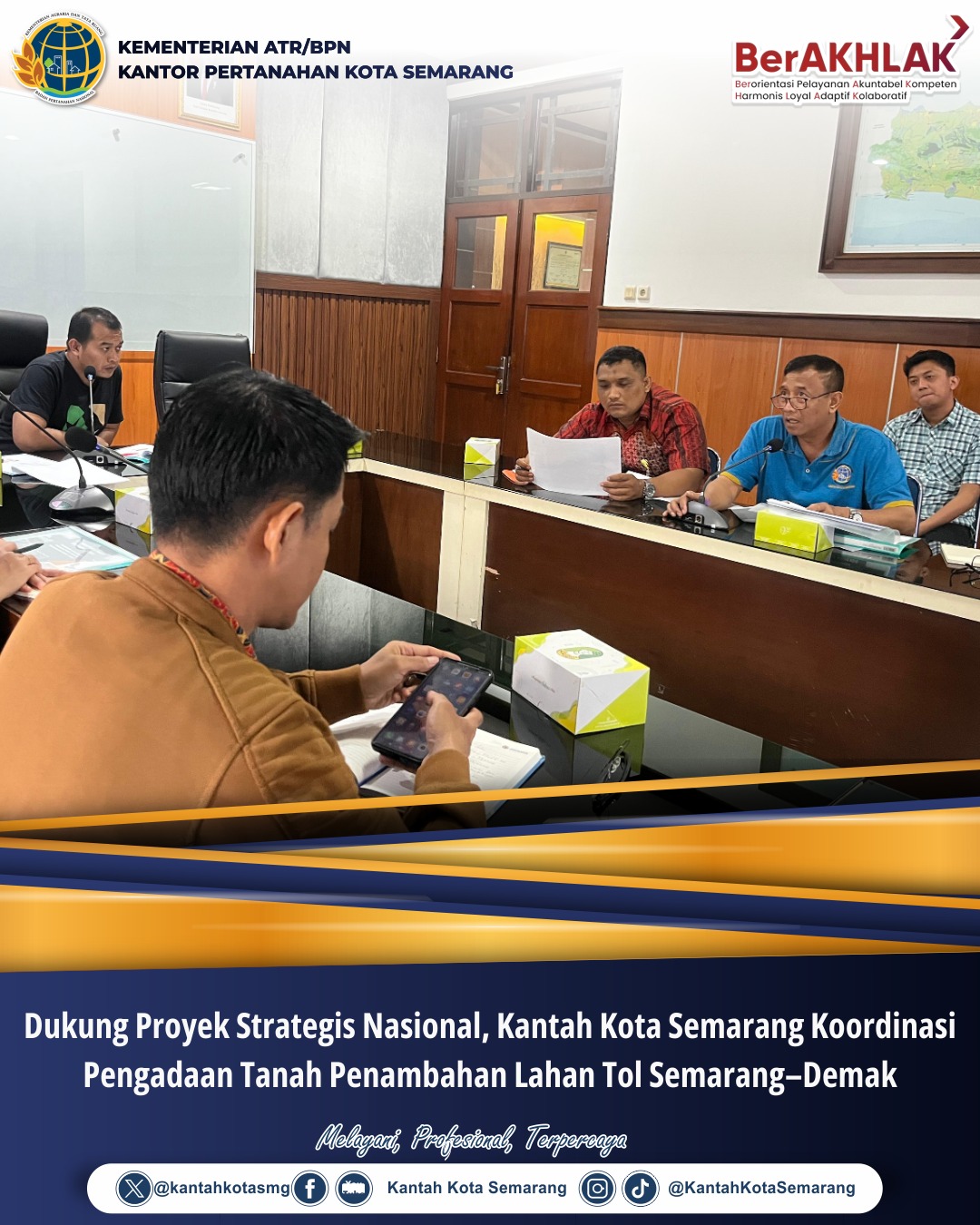 Semarang – Kantor Pertanahan Kota Semarang turut berperan aktif dalam rapat koordinasi pengadaan tanah terkait penambahan lahan ruas jalan tol Semarang–Demak Seksi 1 yang diselenggarakan pada Jumat (25/04/2025) di Ruang Rapat Dinas Perumahan Rakyat dan Kawasan Permukiman Provinsi Jawa Tengah.