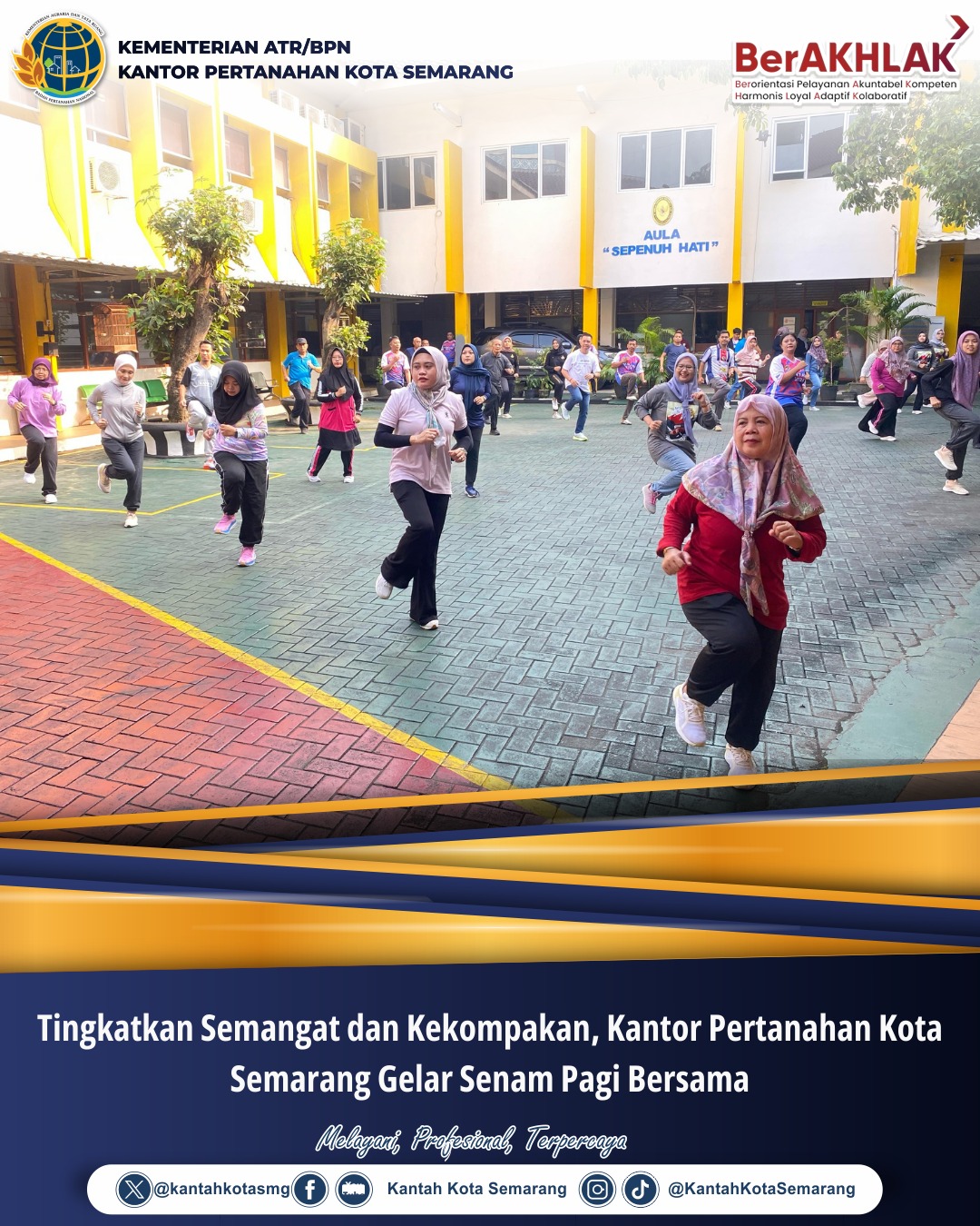 Kegiatan ini diikuti oleh seluruh pegawai Kantor Pertanahan Kota Semarang yang dengan antusias mengikuti gerakan senam yang dipandu oleh instruktur profesional. Suasana penuh semangat dan kekeluargaan terlihat jelas selama kegiatan berlangsung.