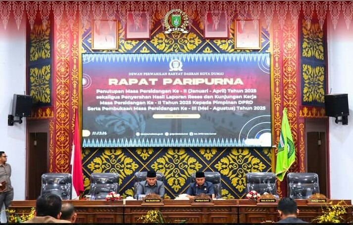 DUMAI (RIAU) TEMPO86.COM//Dewan Perwakilan Rakyat Daerah (DPRD) Kota Dumai menggelar Rapat Paripurna dalam rangka Penutupan Masa Persidangan II (Januari–April) dan Pembukaan Masa Persidangan III (Mei–Agustus) Tahun Sidang 2025, bertempat di Ruang Rapat Paripurna Sekretariat DPRD Kota Dumai, Senin (5/5/2025).