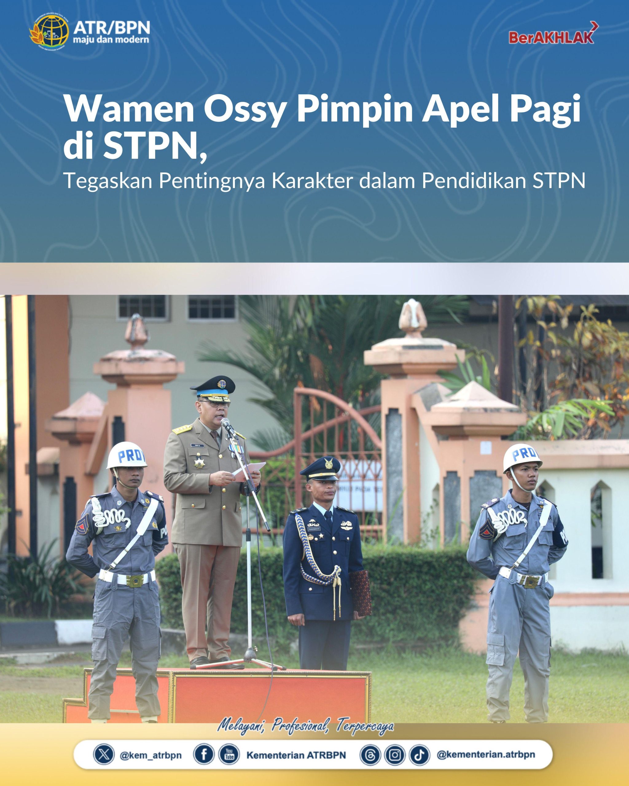 “Sebagai institusi pendidikan tinggi kedinasan di bidang pertanahan dan tata ruang, STPN diharapkan tidak hanya mencetak lulusan yang kompeten secara akademis, tetapi juga membentuk insan pertanahan dan tata ruang yang berkarakter, berintegritas, dan berjiwa nasionalis. Hal ini diwujudkan dalam Sapta Karakter Taruna Bhumi, tujuh karakter utama yang menjadi fondasi moral dan etika bagi setiap Taruna/i STPN,” ujar Wamen Ossy.