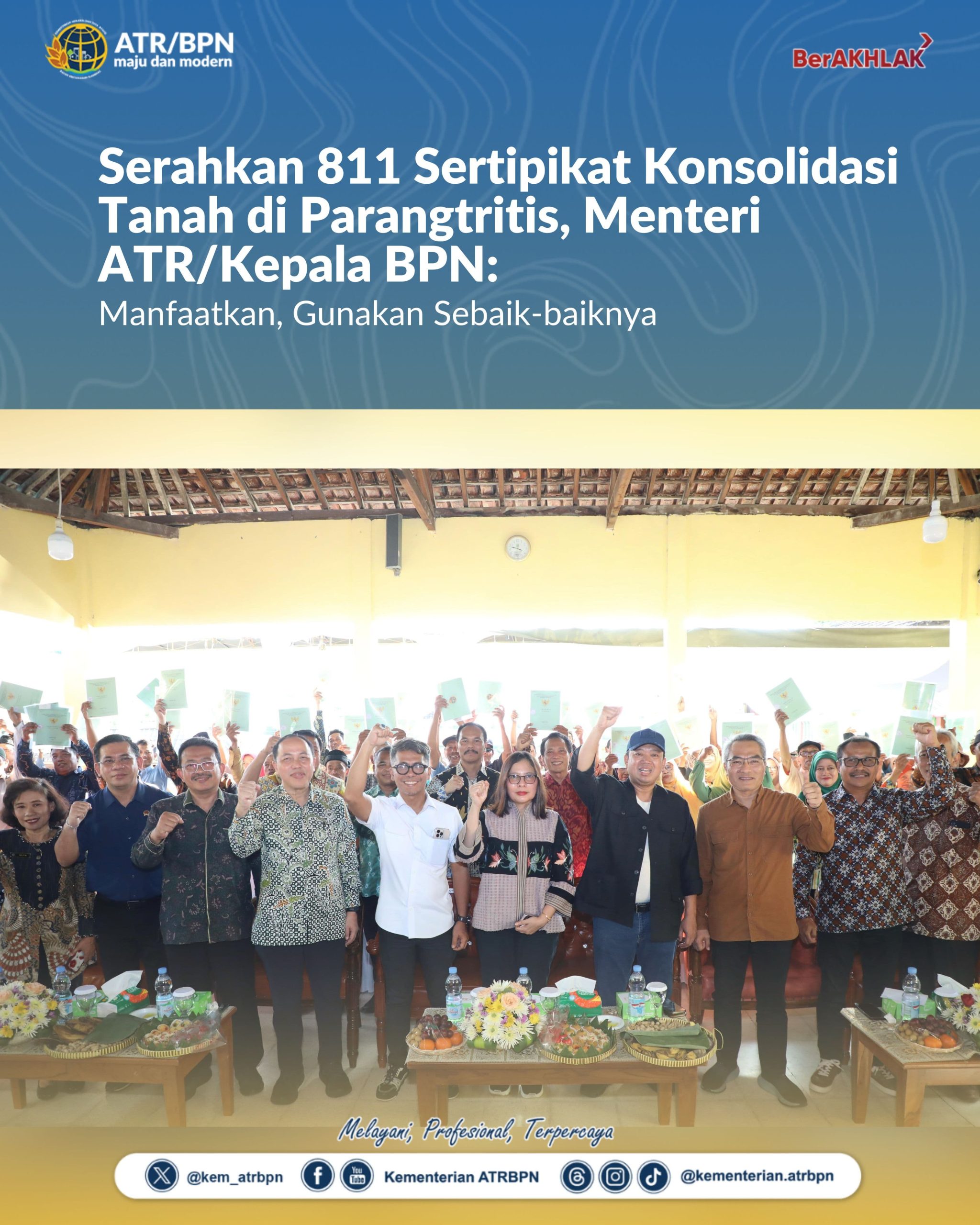 Bantul – Menteri Agraria dan Tata Ruang/Kepala Badan Pertanahan Nasional (ATR/BPN), Nusron Wahid, menyerahkan 811 sertipikat hasil program Konsolidasi Tanah kepada masyarakat Parangtritis, Kabupaten Bantul, D.I. Yogyakarta, Sabtu (10/05/2025). Penyerahan berlangsung di Kantor Lurah Parangtritis dan kehadiran Menteri Nusron di sana disambut antusias oleh warga. Secara khusus, ia berpesan kepada para penerima sertipikat agar memanfaatkan tanah secara produktif dan bertanggung jawab.