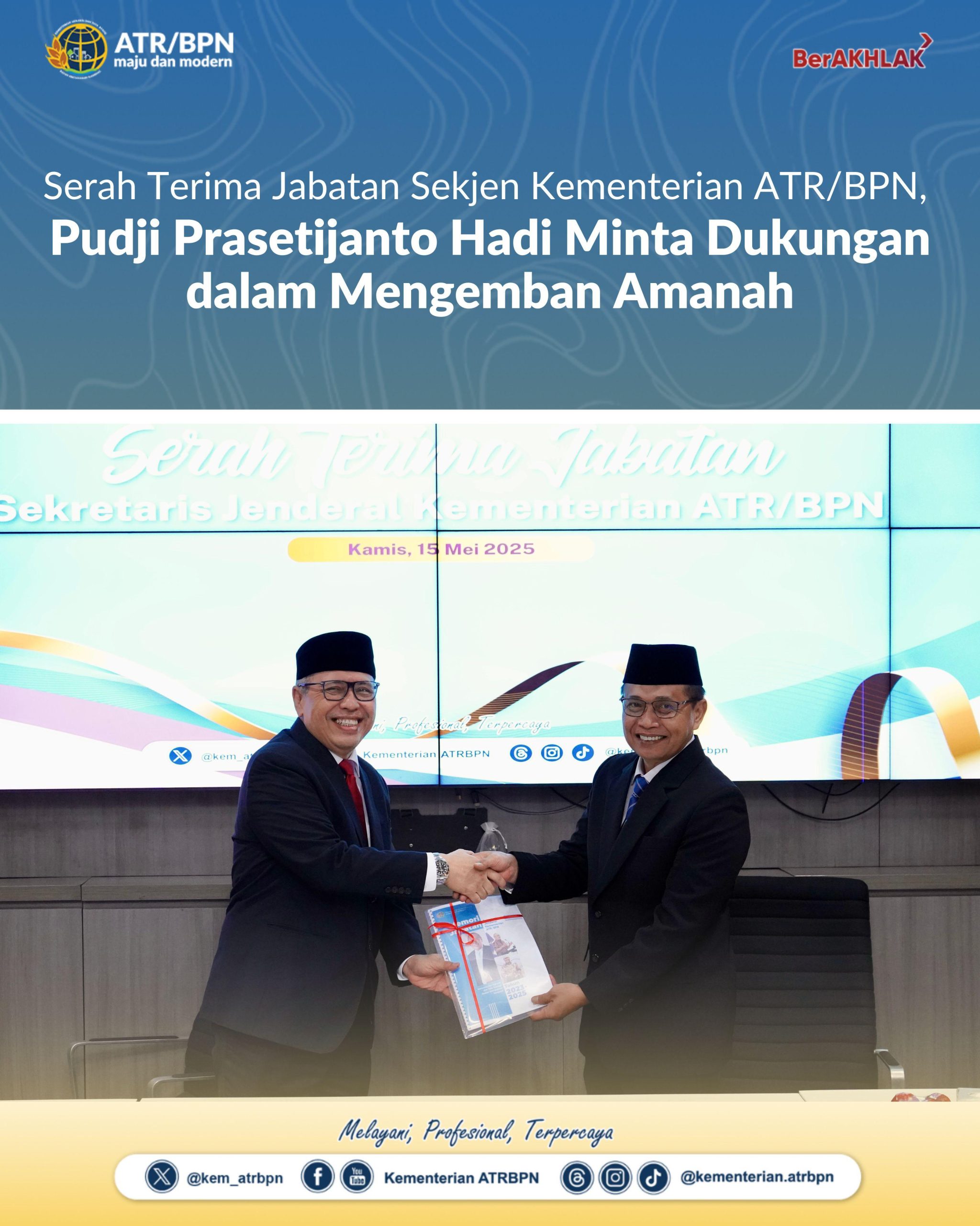 Jakarta – Kementerian Agraria dan Tata Ruang/Badan Pertanahan Nasional (ATR/BPN) menggelar serah terima jabatan (Sertijab) Sekretaris Jenderal (Sekjen) pada Kamis (15/05/2025), di Kantor Kementerian ATR/BPN, Jakarta. Sertijab ini dilakukan setelah Pelantikan Pejabat Struktural terlaksana dalam hari yang sama. Sekjen terlantik, Pudji Prasetijanto Hadi, pada momen ini menyampaikan harapannya agar jajaran ikut mendukungnya dalam menjalankan tugas baru di lingkup pertanahan dan tata ruang