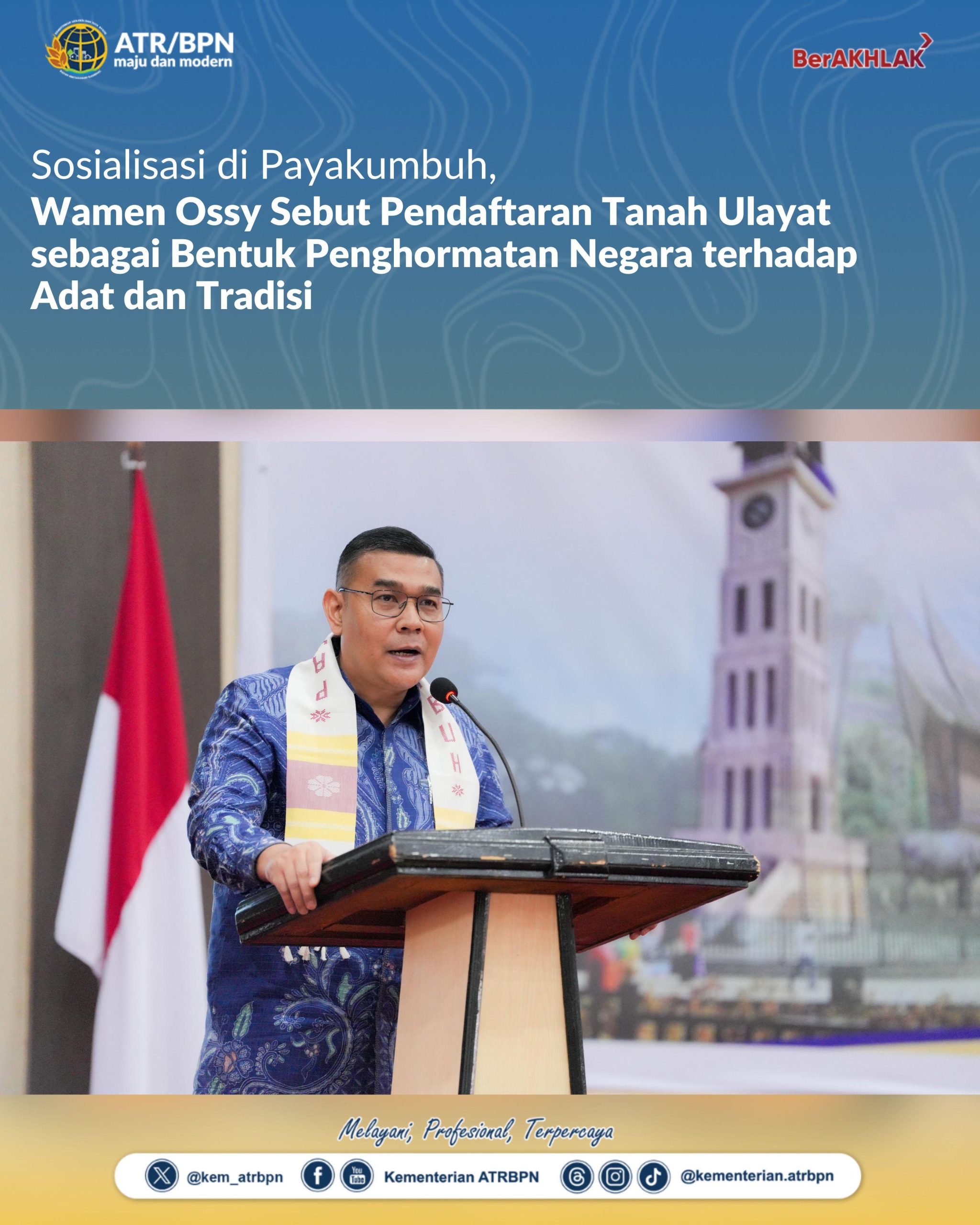 Payakumbuh – Wakil Menteri Agraria dan Tata Ruang/Wakil Kepala Badan Pertanahan Nasional (Wamen ATR/Waka BPN), Ossy Dermawan, menyosialisasikan program Pengadministrasian dan Pendaftaran Tanah Ulayat di Kota Payakumbuh, Sumatera Barat, Selasa (20/05/2025). Dalam sambutannya, ia menegaskan bahwa pendaftaran tanah ulayat bukan sekadar upaya administrasi, melainkan wujud nyata penghormatan negara terhadap nilai-nilai adat dan tradisi yang hidup di tengah masyarakat.