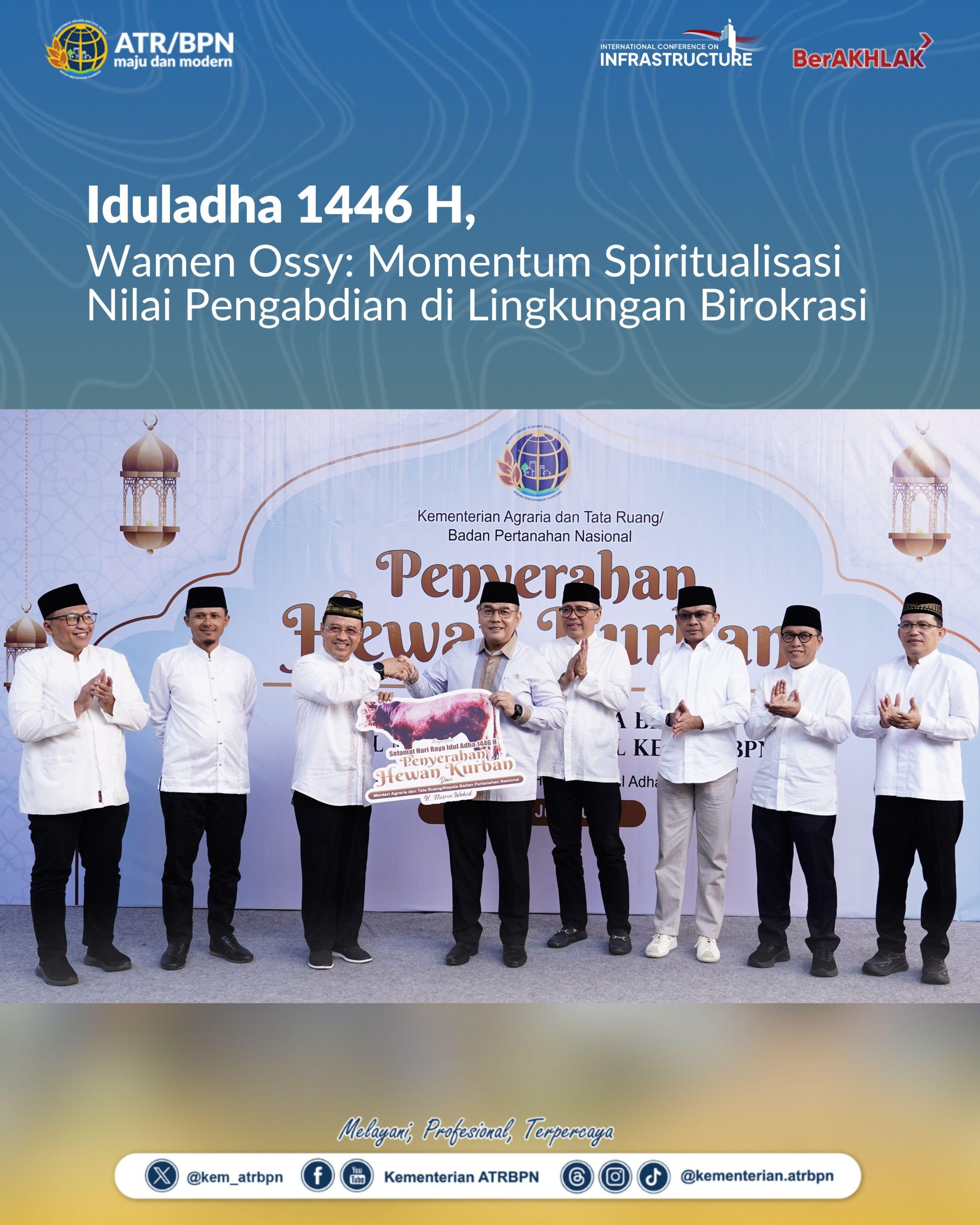 Tahun ini, Kementerian ATR/BPN berhasil menghimpun 80 ekor sapi dan 19 ekor kambing dari para pegawai serta mitra sebagai wujud ibadah. Wamen Ossy menekankan bahwa nilai kurban tidak terbatas pada aspek seremonial, tetapi juga mencerminkan sikap melepas kepentingan pribadi demi kepentingan publik.