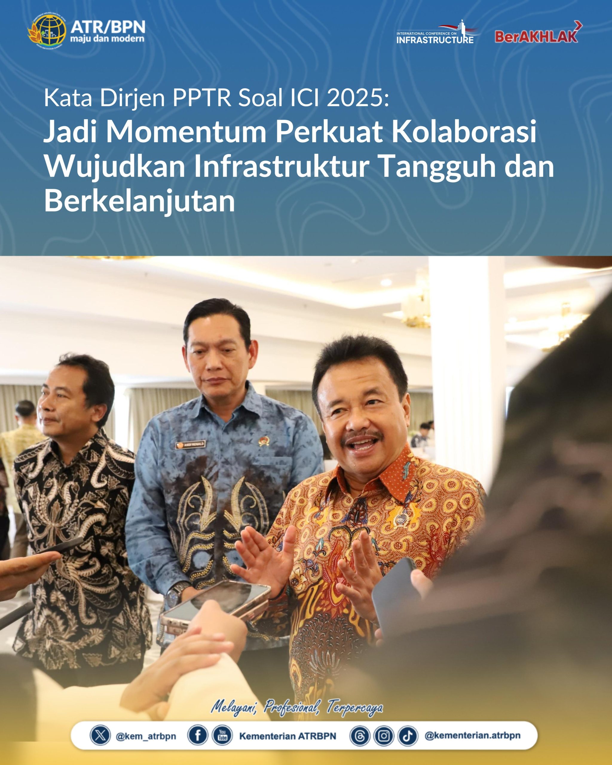 Jakarta – Tempo86.com // Direktur Jenderal Pengendalian dan Penertiban Tanah dan Ruang (Dirjen PPTR) Kementerian Agraria dan Tata Ruang/Badan Pertanahan Nasional (ATR/BPN), Jonahar, menyebut International Conference on Infrastructure (ICI) 2025 merupakan forum strategis yang membuka ruang kolaborasi lintas sektor dalam mendukung pembangunan infrastruktur nasional yang inklusif dan berketahanan. Ia mengatakan hal itu saat menghadiri Pembukaan ICI 2025 yang berlangsung di Jakarta International Convention Center (JICC), Rabu (11/06/2025).