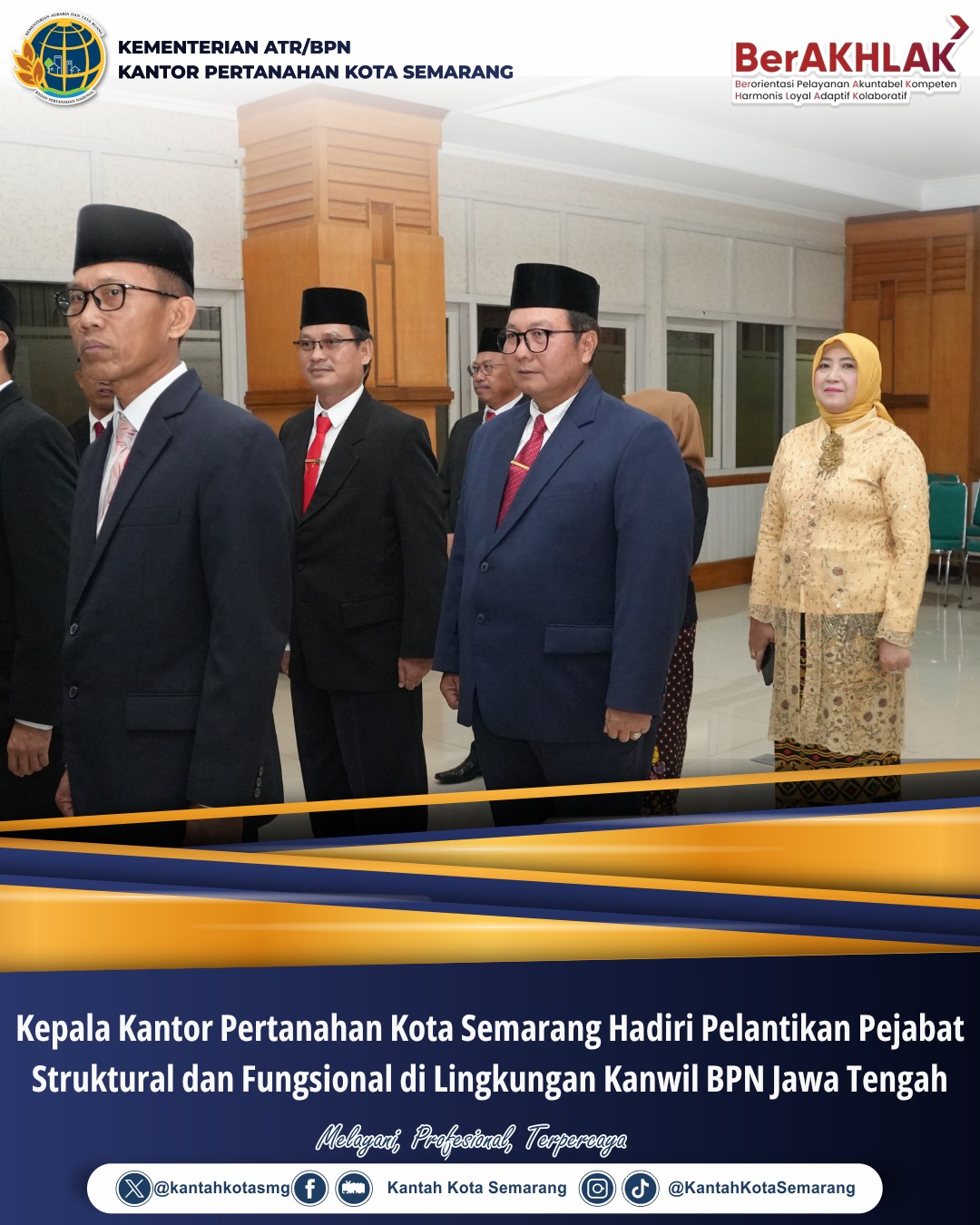 Semarang – Kepala Kantor Pertanahan Kota Semarang, Rudi Prihantoro, A.Ptnh., M.M., M.H., QRMP., menghadiri Pelantikan dan Pengambilan Sumpah/Janji Jabatan Struktural dan Fungsional yang diselenggarakan oleh Kantor Wilayah Badan Pertanahan Nasional Provinsi Jawa Tengah, pada Senin (23/06/2025).