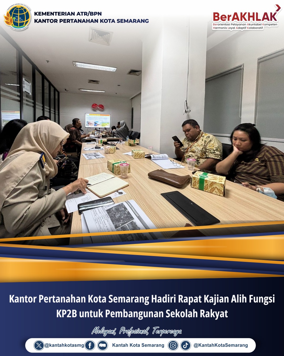 Semarang – Sebagai bentuk dukungan terhadap program pembangunan pendidikan yang berkelanjutan di Kota Semarang, Kantor Pertanahan Kota Semarang menghadiri Rapat Pembahasan Kajian Alih Fungsi Kawasan Pertanian Pangan Berkelanjutan (KP2B) untuk keperluan pembangunan Sekolah Rakyat, pada Selasa (1/07/2025).