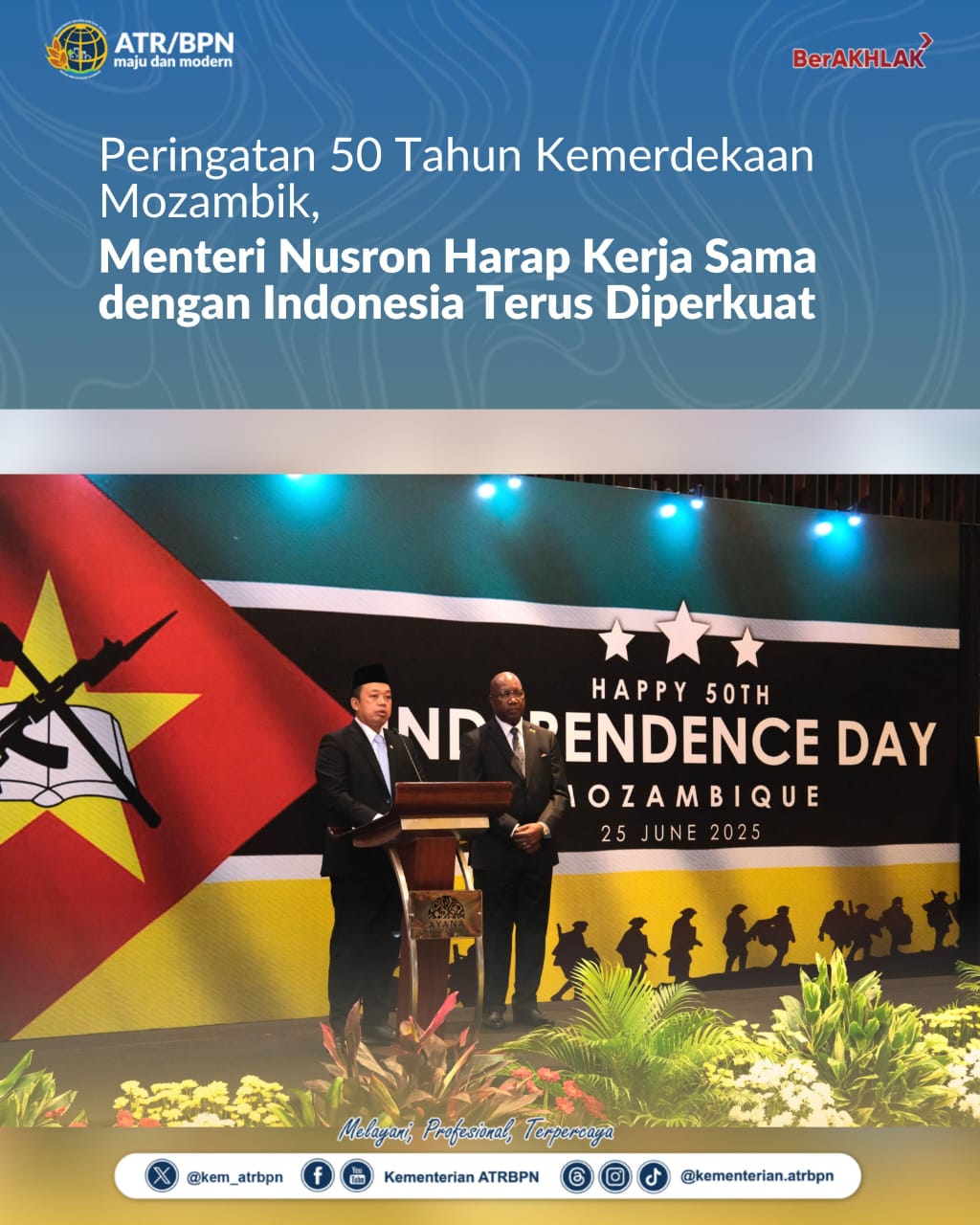 “Atas nama pemerintah dan rakyat Republik Indonesia, izinkanlah saya mengucapkan selamat kepada pemerintah dan rakyat Republik Mozambik atas pencapaian yang luar biasa selama lima dekade terakhir,” tutur Menteri Nusron.