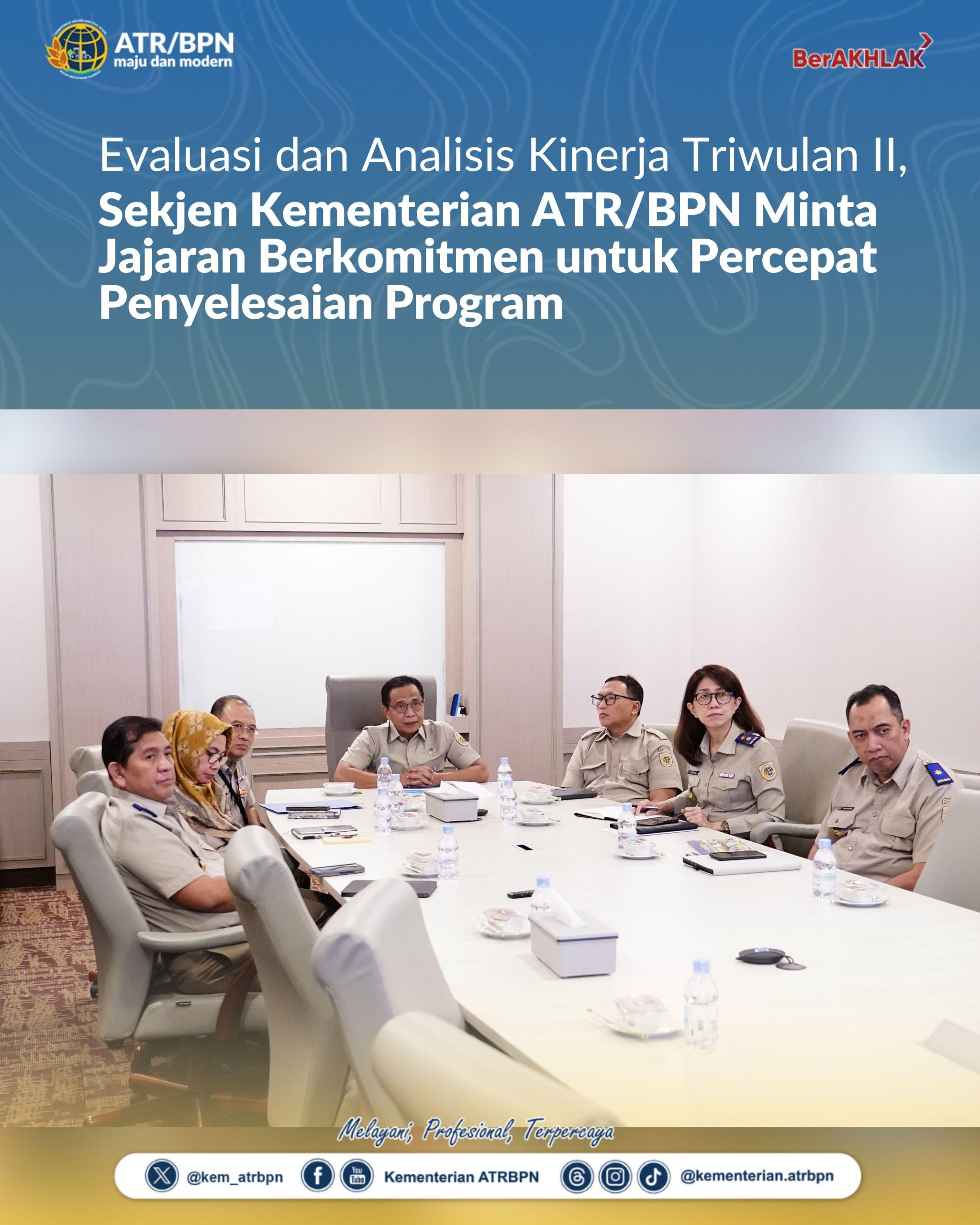 Jakarta – Kementerian Agraria dan Tata Ruang/Badan Pertanahan Nasional (ATR/BPN) menggelar Evaluasi dan Analisis Kinerja Program dan Kegiatan Triwulan II Tahun 2025, Senin (14/07/2025). Dari hasil evaluasi, Sekretaris Jenderal (Sekjen) Kementerian ATR/BPN, Pudji Prasetijanto Hadi, meminta jajaran untuk berkomitmen menyelesaikan program yang sudah direncanakan sejak awal tahun.