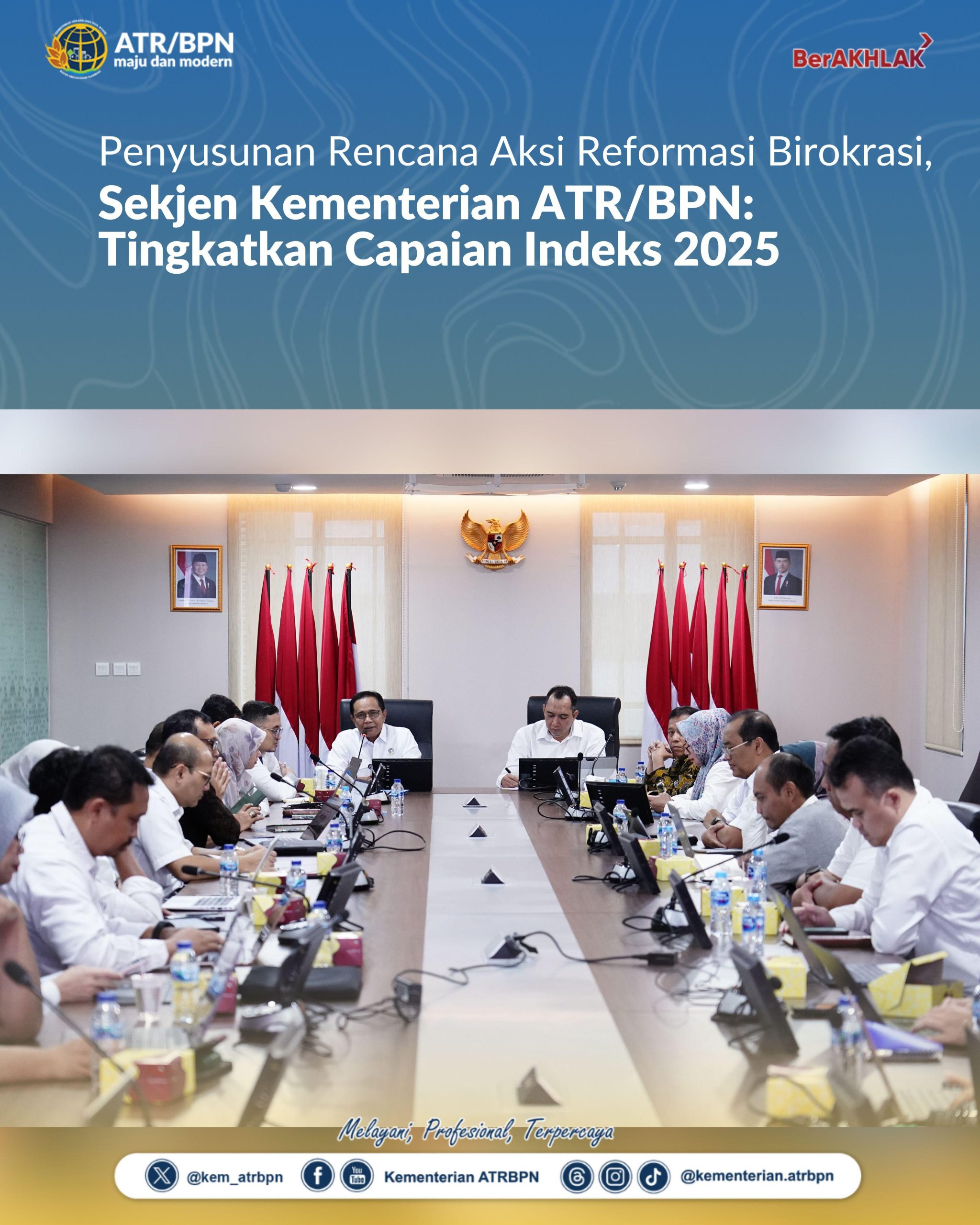 “Saya ingin memberikan beberapa penekanan agar apa yang sudah kita rencanakan dalam RB bisa benar-benar tercapai. Jika target indeks ini berjalan sesuai rencana, insyaallah akan berdampak langsung pada peningkatan _take home pay_ atau pendapatan kita,” ucap Pudji Prasetijanto Hadi saat membuka Rapat Penyusunan Rencana Aksi RB di Kantor Kementerian ATR/BPN, Jakarta, Selasa (15/07/2025).