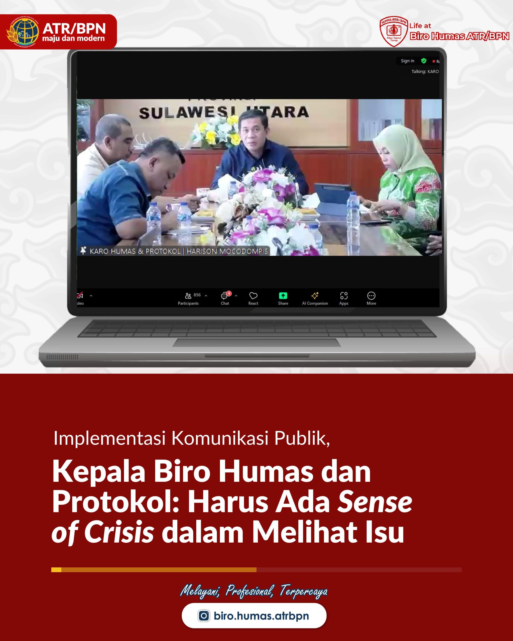 “Ini harus ada semacam _sense of crisis_ yang tinggi di antara teman-teman, tidak saja mampu menjalankan program dengan baik, menaati SOP (Standar Operasional Prosedur) dan apa pun yang menjadi barometer atau aturan main pelaksanaan program. Tetapi, juga harus lihat apa yang menjadi sentimen masyarakat hari ini, apa yang menjadi sentimen media,” ujar Harison Mocodompis saat memberikan pengarahan dalam Penutupan Evaluasi dan Analisis Kinerja Program dan Kegiatan Kementerian ATR/BPN Triwulan II Tahun 2025 secara daring.