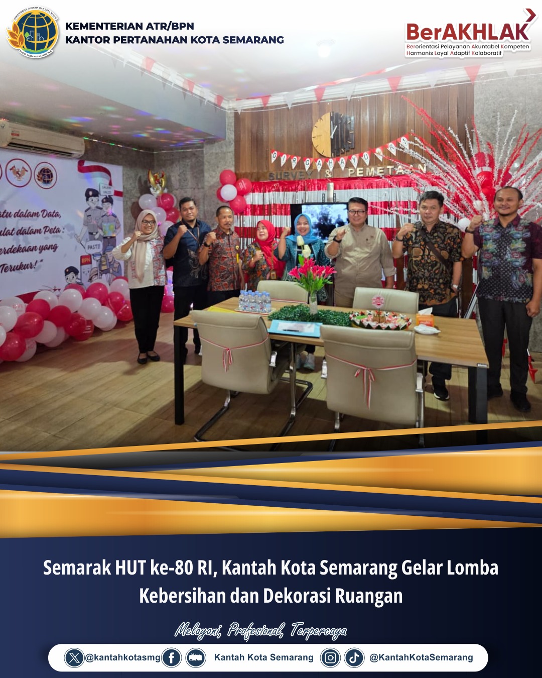 Dalam rangka memeriahkan perayaan Hari Ulang Tahun ke-80 Kemerdekaan Republik Indonesia, Kantor Pertanahan Kota Semarang menggelar lomba kebersihan dan menghias ruangan, Kamis (14/08/2025). Penilaian dilakukan langsung oleh dewan juri yang terdiri dari Kepala Kantor Pertanahan Kota Semarang, Rudi Prihantoro, A.Ptnh., M.M., M.H., QRMP., bersama para pejabat pengawas, dengan berkeliling ke setiap ruangan di seluruh subbagian dan seksi.