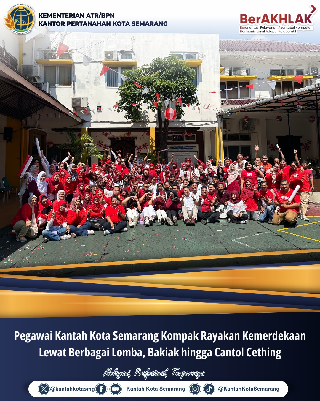 Semarang- Dalam rangka memperingati Hari Kemerdekaan Republik Indonesia ke-80, Kantor Pertanahan Kota Semarang menggelar berbagai lomba meriah yang diikuti seluruh pegawai, mulai dari PNS, PPPK, PPNPN, ASK, hingga peserta magang PPAT dan mahasiswa. Kegiatan berlangsung di halaman Kantor Pertanahan Kota Semarang pada Jumat (15/08/2025) dengan penuh antusiasme dan keceriaan.