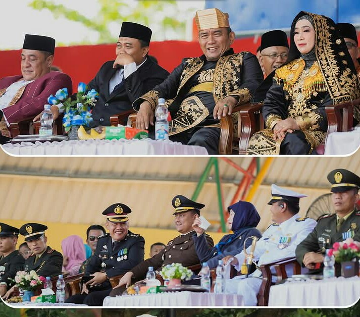 Wakil Walikota Dumai Sugiyarto tampil gagah dengan setelan pakaian adat Minang berwarna gelap, lengkap dengan destar (penutup kepala) dan kain songket yang dililitkan di pinggang.